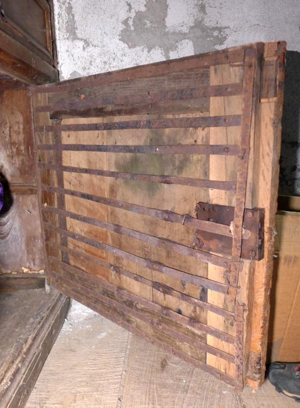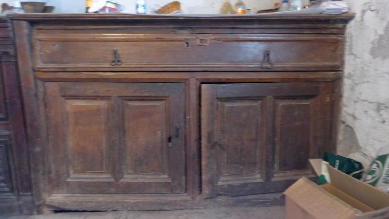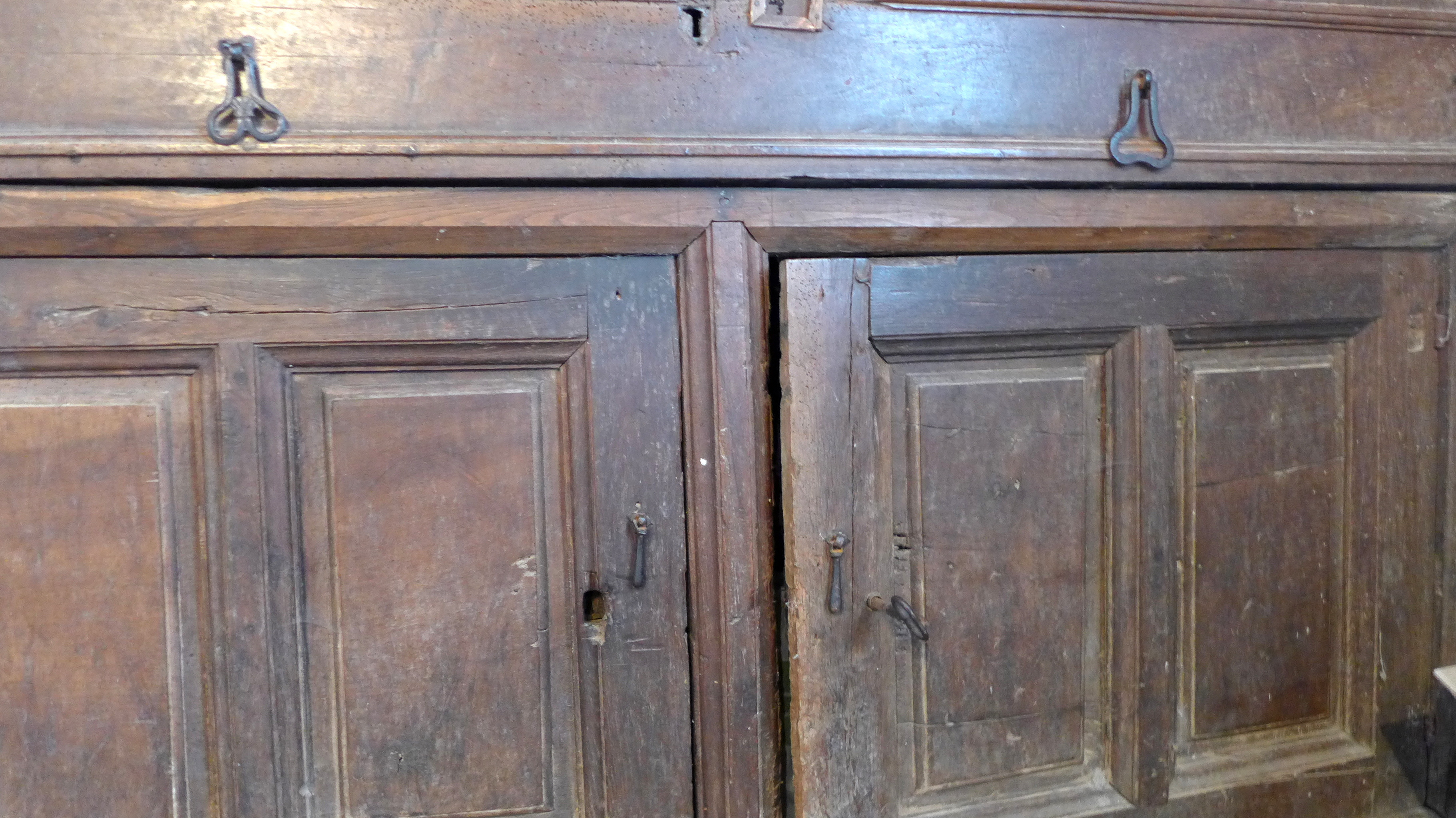 Se compone de dos filas, la inferior con dos hojas de apertura hacia el exterior y sendos tiradores de forja, y la superior con un solo cajón (con dos tiradores de forja) que ocupa todo el frente.