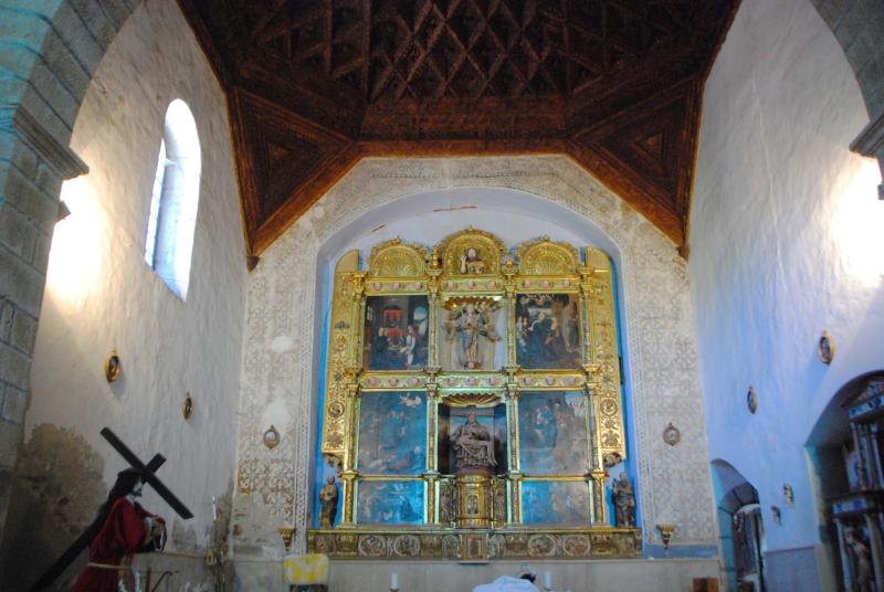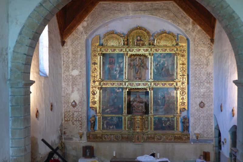 Retablo mayor, de profusos relieves, talla y pintura. Compuesto de banco, dos cuerpos y ático, en horizontal, y tres calles en vertical de estructura simétrica, flanqueadas por polseras.