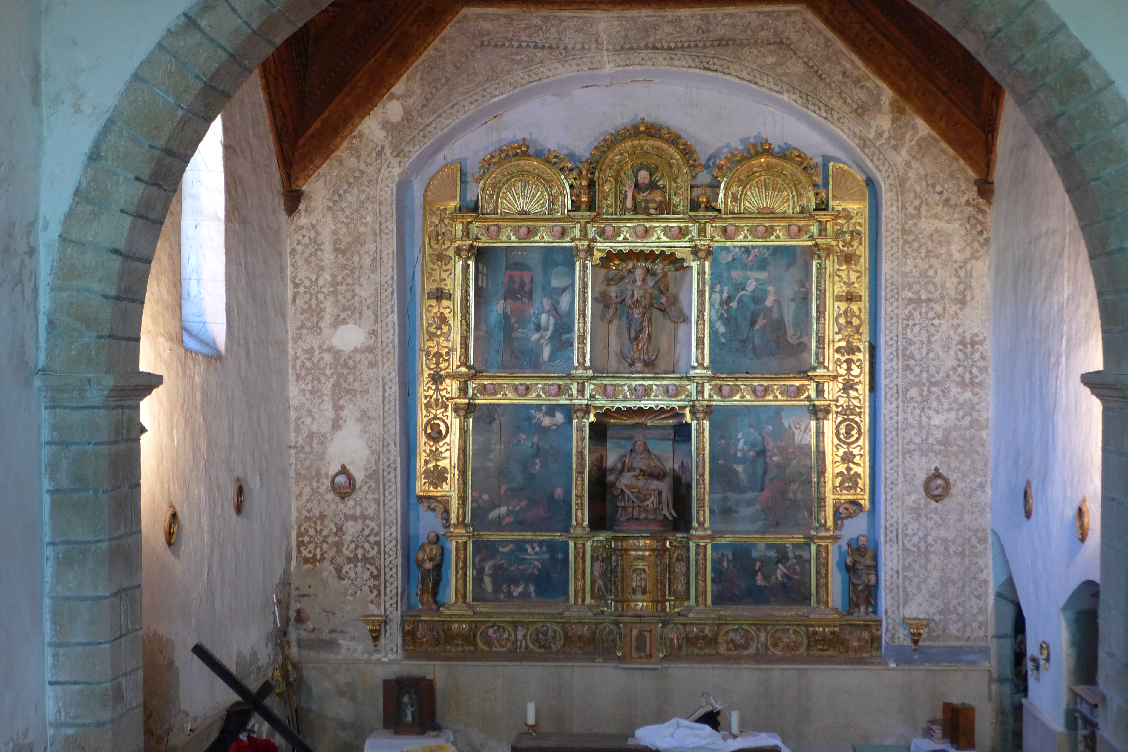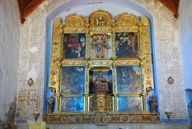 Los relieves se concentran en el banco y ático (Padre Eterno), la calle central se ocupa con tallas y las laterales con tablas pintadas.