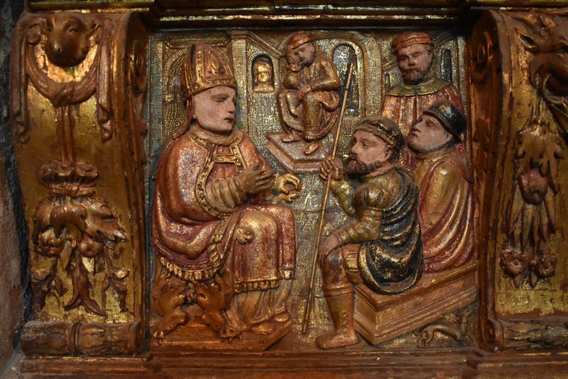 Voces Jolías ha propuesto que se trate de un pasaje de la iconografía de san Ambrosio (frente a otra propuesta que afirmaba que era san Leandro).