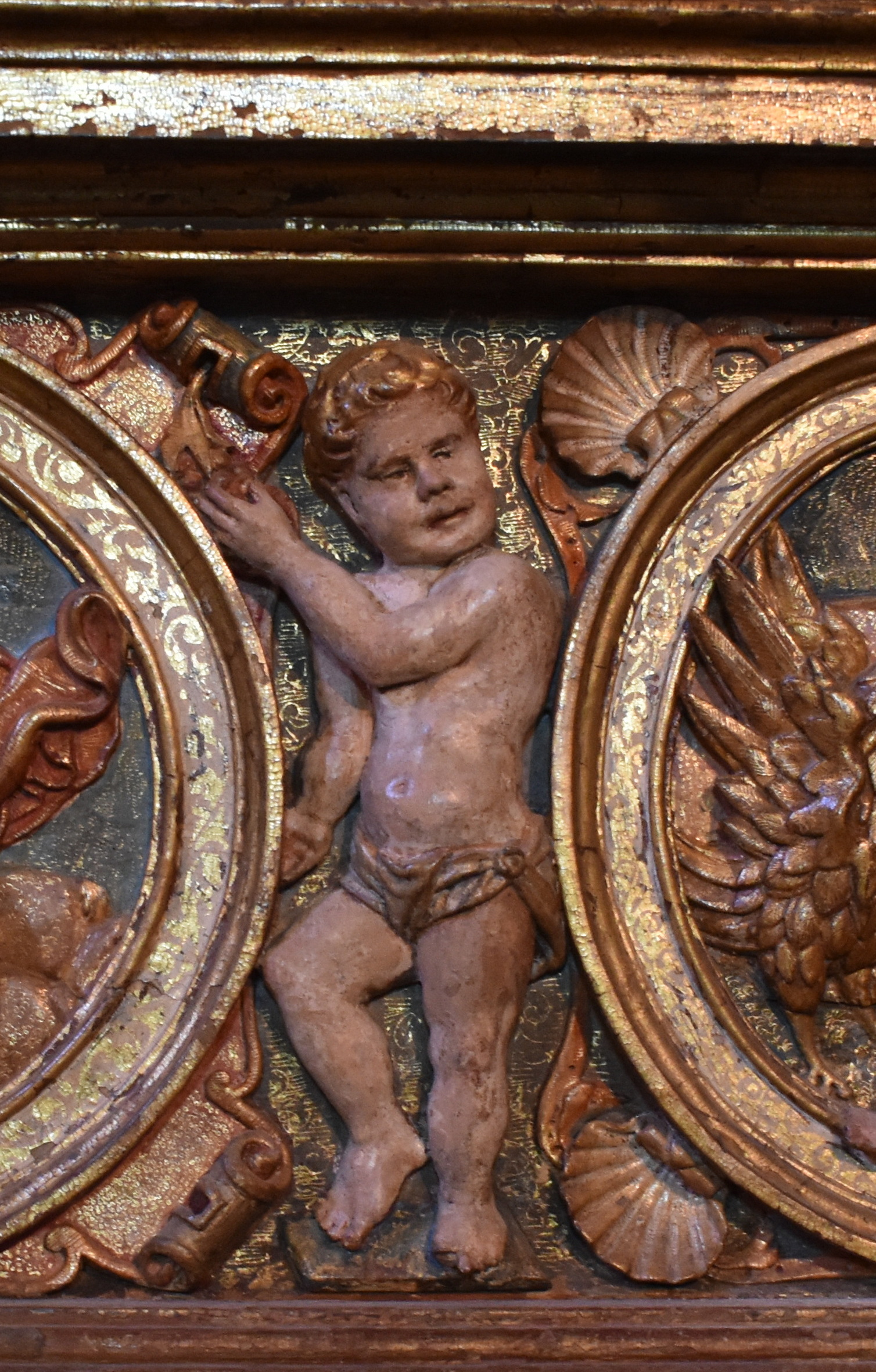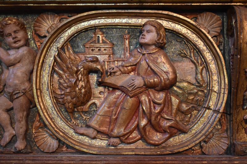 San Juan: Relieve enmarcado en un óvalo de talla dorado y policromado. San Juan, sentado e imberbe (el único de los cuatro), escribe el Evangelio en actitud absorta.