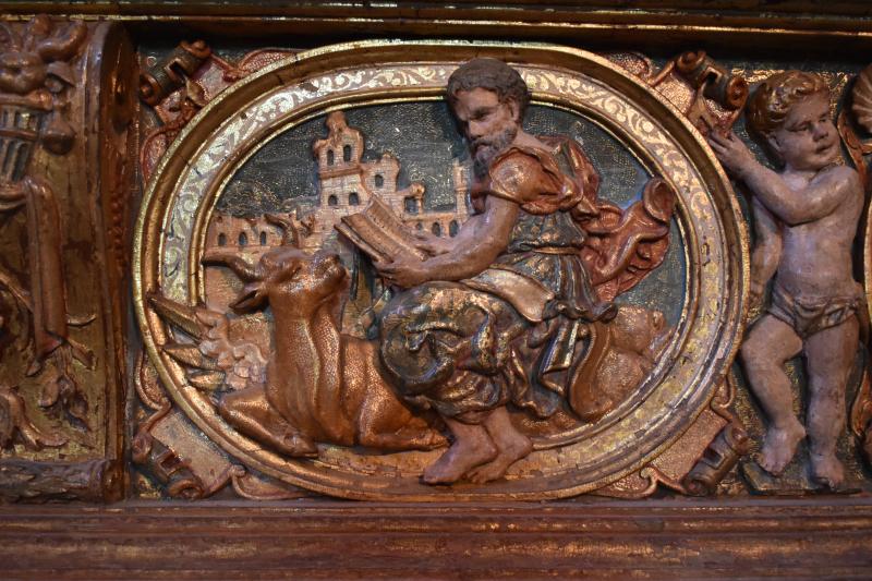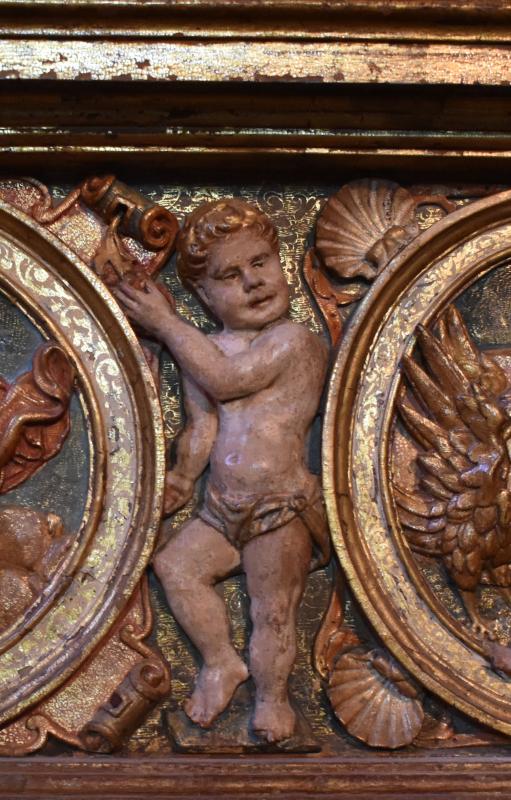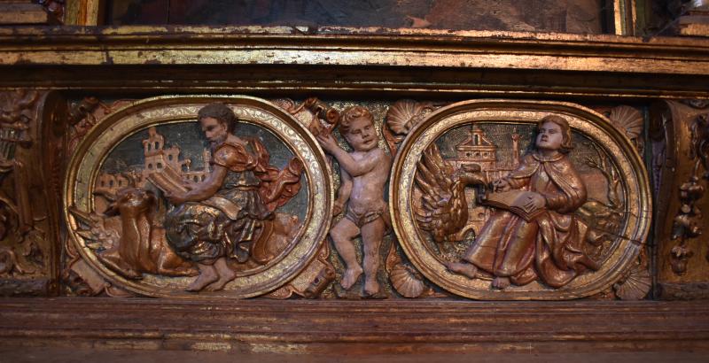 San Lucas: Relieve enmarcado en un óvalo de talla dorado y policromado. El santo se sienta sobre el toro que lo identifica. Mira de soslayo al espectador mientras sostiene el Evangelio. Un fondo urbano con protagonismo da profundidad a la escena, avivada por los pliegues de su vestido y mando, al aire este último.