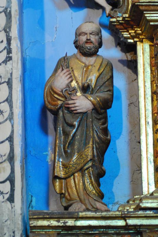 Figura estofada en bulto redondo que muestra a un San Pedro de pie, barbado y con amplias entradas. Se atavía con vestido y manto y porta dos grandes llaves que sostiene con ambas manos.