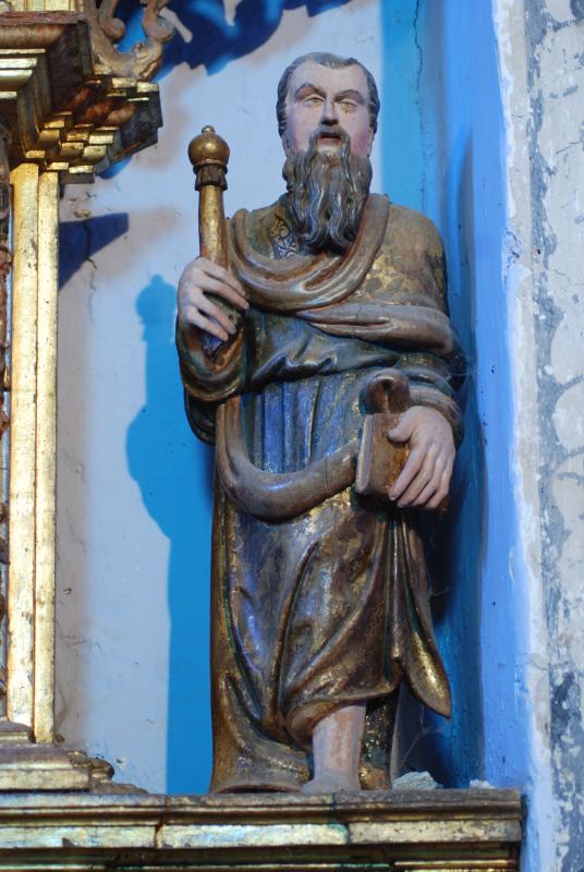 Figura estofada en bulto redondo que muestra a un San Pablo de pie, barbado e incipiente calvicie, como es costumbre. Se atavía con vestido y manto, con complicadas vueltas. Su mano izquierda sostiene un libro cerrado y la derecha (ambas sobredimensionadas) una gran espada de la que se ha perdido la hoja .