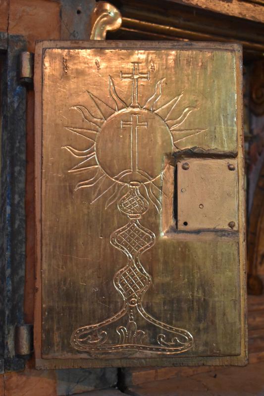 En una arquitectura formada por una hornacina flanqueada por pilastrillas que sostienen un frontón triangular, se destaca el relieve de la Resurrección sobre fondo avenerado.