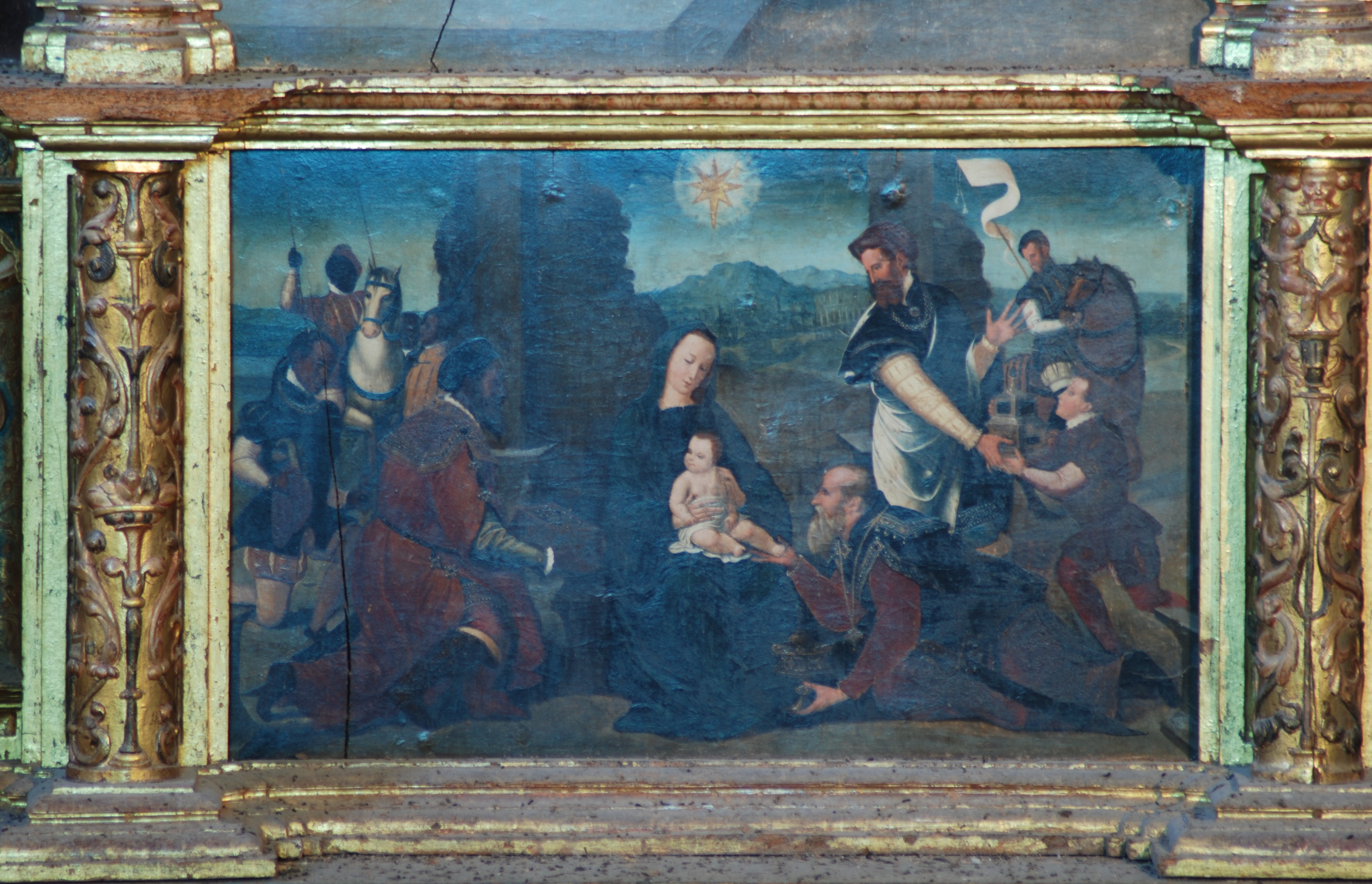 Los tres reyes se disponen a ambos lados del pequeño, y le ofrecen sus presentes. Tres pajes se sitúan en segundo término, negro también el de Baltasar.