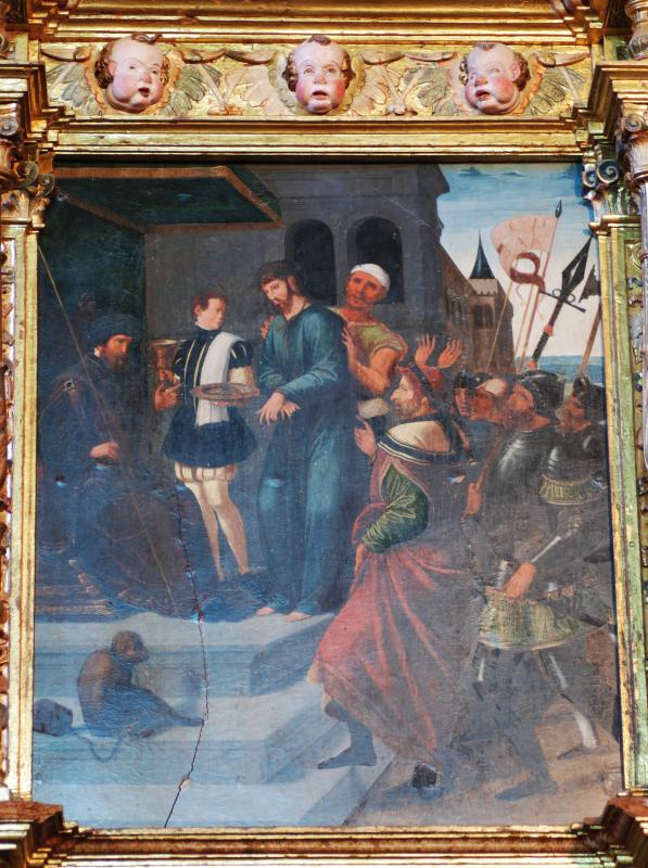 Los personajes de esta escena se arraciman dando sensación de la confusión, tan solo liberada por las gradas que conducen al trono bajo dosel donde Pilatos se dispone a dictar sentencia ante Cristo, sujetado por un sayón y precedido de un personaje de atavíos lujosos renacentistas que sujeta copa y plato en el que el prócer procederá a lavarse las manos.