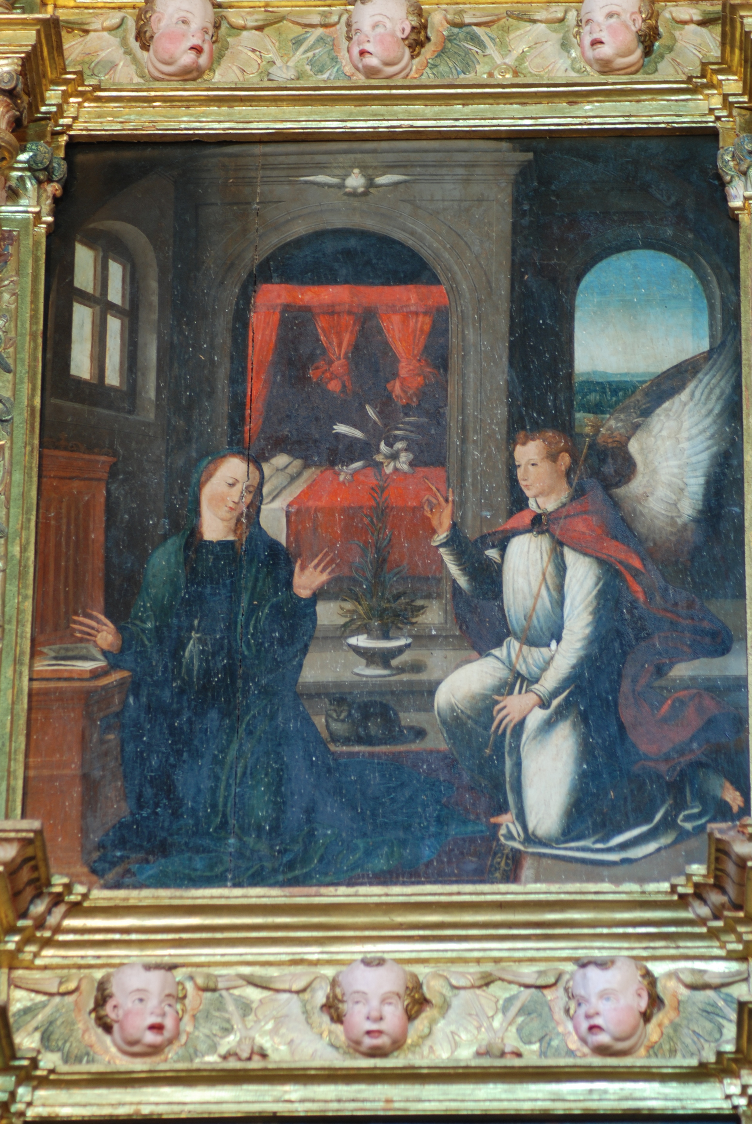 Interior de una amplia estancia. El ángel, arrodillado, ha sorprendido a María, sentada, que leía un pequeño libro en un escritorio. Un jarrón de azucenas se dispone entre los dos en segundo plano, rompiendo la peligrosa cercanía física. La paloma del Espíritu Santo, en el centro superior de la imagen, preside el conjunto.