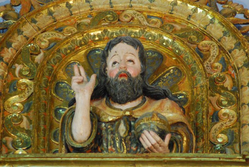 Busto del Padre Eterno. La cabeza dispone de largos cabellos que caen simétricos sobre el manto que cubre los hombros. Destaca su barba hirsuta. Su gesto es inexpresivo. Levanta su descubierto brazo derecho, con actitud de bendecir, y en la mano izquierda sostiene un orbe.
