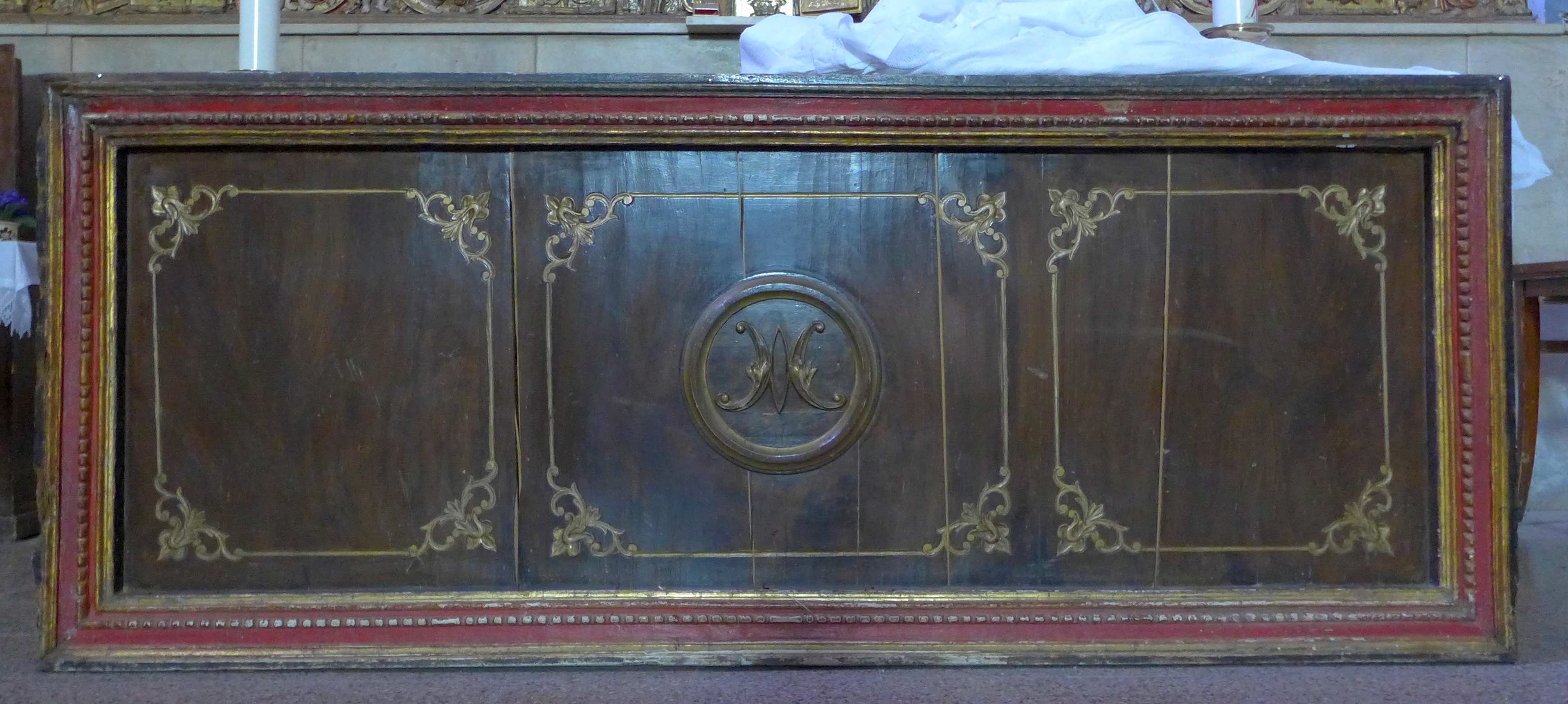 Sencillo marco moldurado y policromado que realza un frontal de altar compuesto por un tablero dividido en tres plafones con un anagrama mariano en relieve en su parte central.