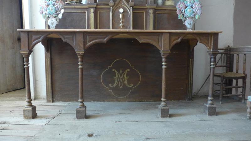 Apoya la estructura sobre un tablero con un anagrama mariano. Para sujetar la "mesa de altar" (un simple tablero horizontal) se bastan cuatro patas torneadas y avanzadas.