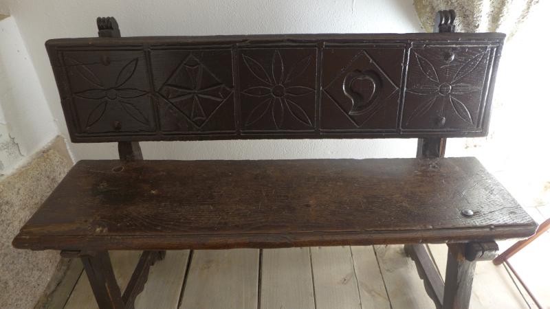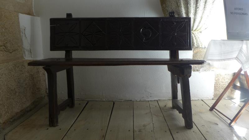 Escaño o banco de naturaleza netamente funcional, pero en el que el tallista se esmeró en el trabajo del respaldo dibujando cinco cuadrados que inscriben rosetas, cruces de travesaños patados e incluso un rombo con un corazón. Respaldo y asiento están conformados a partir de sendas piezas de madera de castaño.