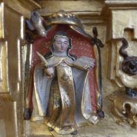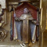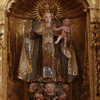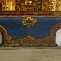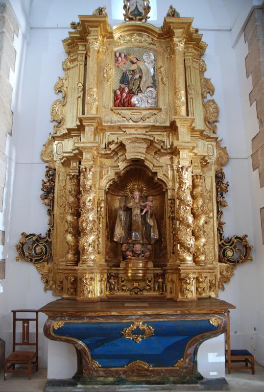 Retablo de estilo barroco rococó compuesto de un único cuerpo, un escueto banco y ático de gran desarrollo, casi tanto como el cuerpo sobre el se alza. Su estructura y decoración mezcla elementos de los conjuntos puramente barrocos, como las columnas salomónicas, y rococós, como las rocallas y los vegetales estilizados. Sus perfiles resultan extraordinariamente movidos y quebrados, como se pone de relieve tanto en el banco como en los distintos entablamentos, con abundantes entrantes y salientes y superposiciones de piezas. El cuerpo principal lleva dos pares de columnas salomónicas con sus correspondientes pilastras. Sin embargo en el ático los soportes son columnas clásicas con el tercio inferior del fuste destacado y tallado. Todo el exterior de la máquina está flanqueado por una trabajada polsera a base de ces, rocallas y exornos fitomorfos entre formas cóncavo-convexas, lineas ondulantes que imperan en todo el conjunto. En cuanto a la imaginería, el cuerpo bajo lleva imágenes de bulto redondo y el ático y coronación relieves.