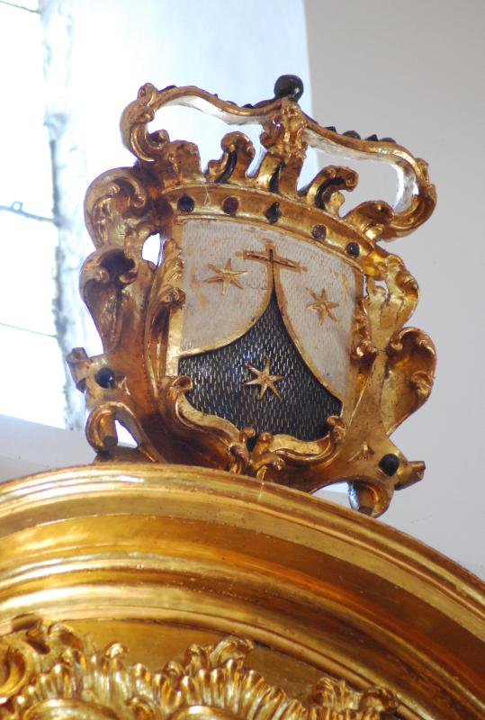 Escudo de armas de la orden del Carmelo, rodeado por una cartela de motivos vegetales de raigambre rococó y timbrado por corona real cerrada. Todo ello va dorado, a excepción del interior del escudo policromado con los característicos colores blanco y negro y algunos pequeños detalles ornamentales en la corona.