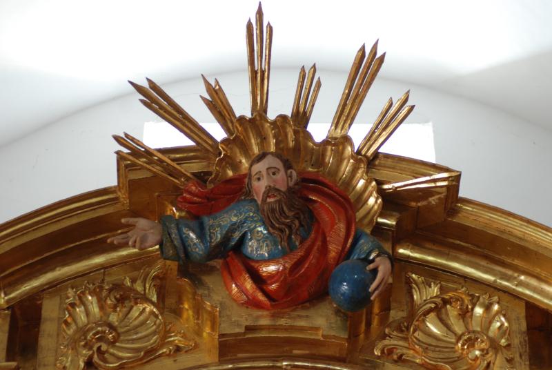 Figura de Dios Padre en altorrelieve y con partes en bulto redondo. El protagonista se muestra vestido de túnica azul y manto rojo, mano derecha extendida mientras en la izquierda recoge el orbe. Su rostro, de escasa expresividad, enlaza con los del anterior relieve, luce larga barba y melena. Alrededor del movido manto asoma una gran rocalla y un resplandor de rayos.