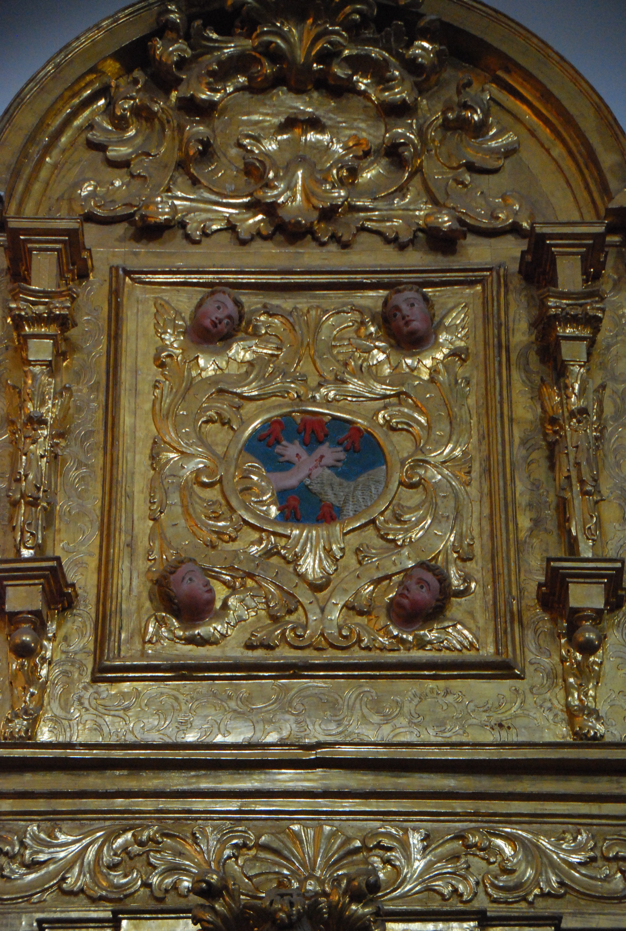 El relieve que remata el segundo cuerpo del retablo o su ático, según se mire, no es sino una composición de carácter simbólico. Entre hojarascas y tornapuntas arrocallados, asoman cuatro cabezas de querubes y en su centro un medallón oval con las armas de la Orden de san Francisco: las cinco llagas de Cristo y los brazos cruzados de san Francisco de Asís (vistiendo el sayal) y de Jesucristo (desnudo), ambos mostrando sus respectivas heridas.