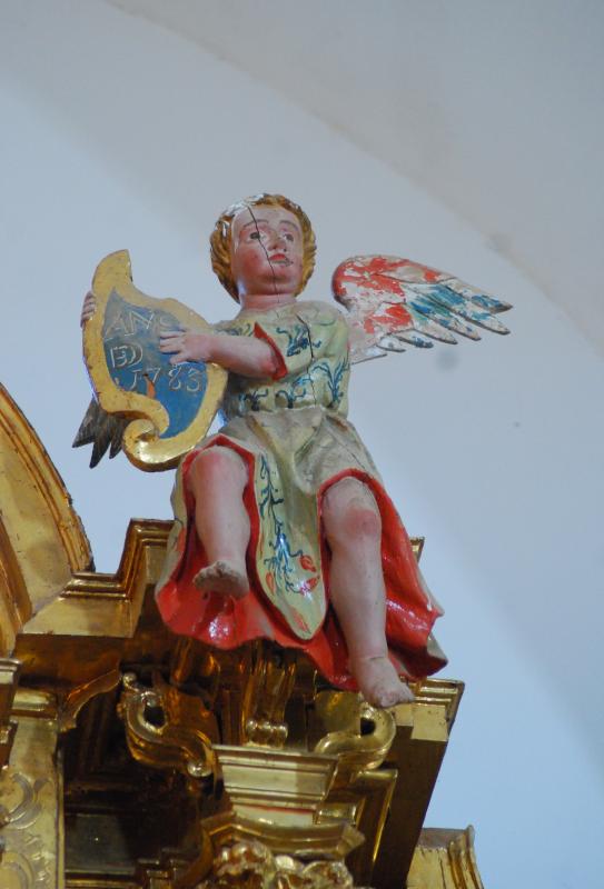 Escultura de bulto redondo de un gracioso angelito sentado sobre el remate derecho (según se mira) del ático. Viste túnica larga, ceñida a la cintura y policromada de colores verdosos con flores en el anverso y de color rojo en el reverso. De sus hombros nacen sendas alas, coloreadas en rojo y azul. Luce cabellera corta y rubia. Entre sus manos porta una cartela de movidos perfiles que podría confundirse con una suerte de arpa o lira, pero en realidad es una superficie lisa que sirve para colocar parte de una inscripción en la que se recoge la fecha de dorado de retablo.