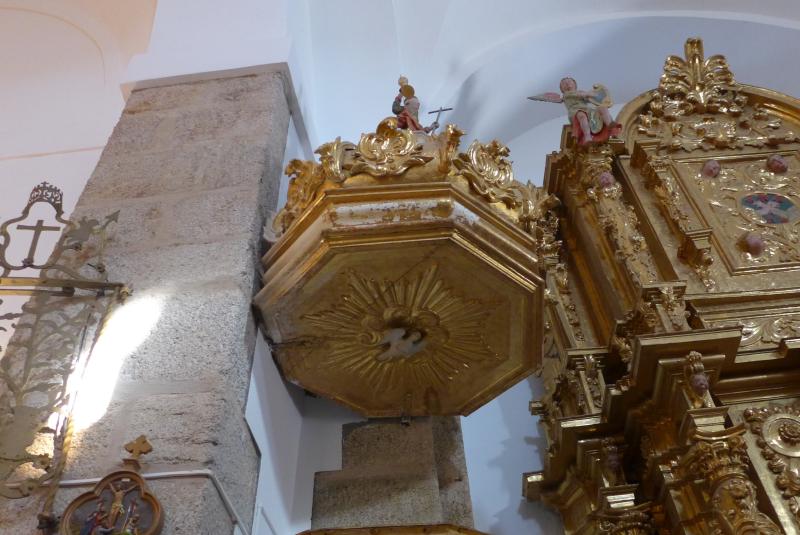 Sombrero o tornavoz del púlpito. Tiene base octogonal y desarrollo bulboso en altura. La parte inferior es profusa en molduras de carácter geométrica, mientras en cascarón, que mantiene ese perfil octogonal, se llenó con grandes costillas arrocalladas y cartelas de motivos rococós. Todo él va dorado, y sobre el tablero de la base de talló un resplandor del que pende la paloma del Espíritu Santo.