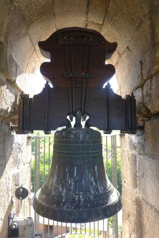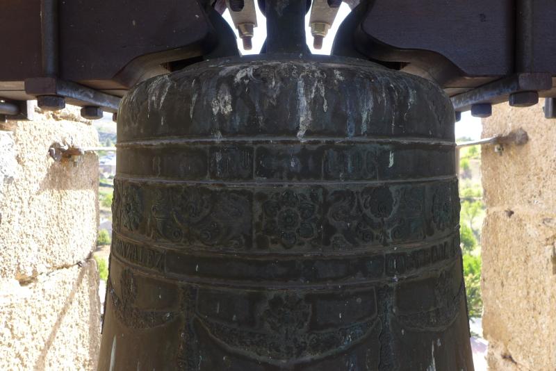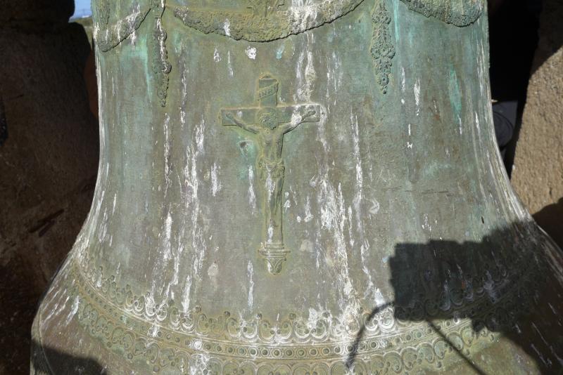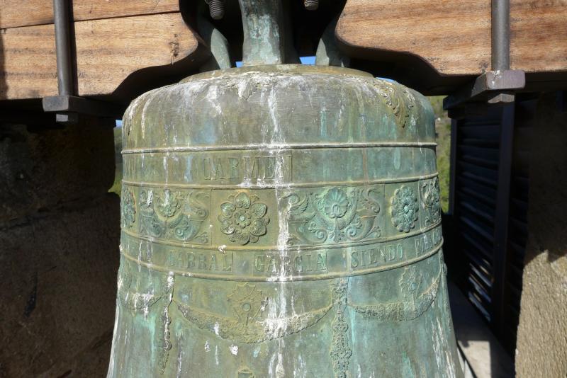 xxx En el hombro cordón e inscripción: AÑO 1906 CARMEN. En el centro cordón, banda decorativa e inscripción: COSTEADA SU FUNDICIÓN POR DOÑA ANGELA CARRAL GARCIA. SIENDO MAYORDOMO JOSE M. GONZALEZ. En el medio pie: crucificado. En el pie festoneados y tracerías