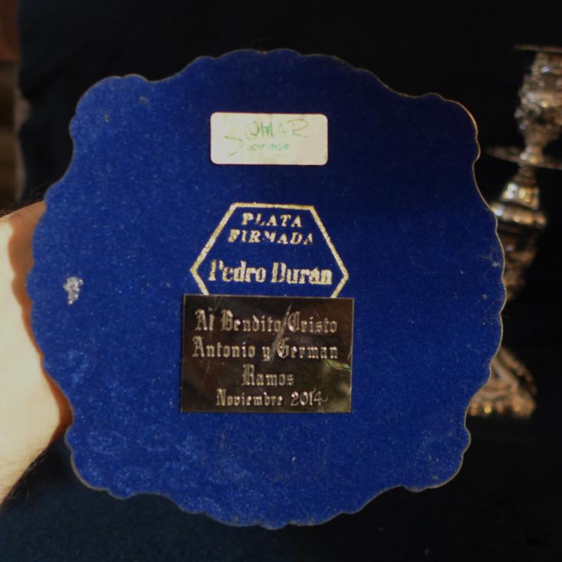 No se ha pesado por contener en su interior otros materiales además de la plata. En el interior de su pie, sobre una tapa de color azulado ambos muestra una cartela con la leyenda "Al Bendito Cristo / Antonio y German Ramos / Noviembre 2014"
