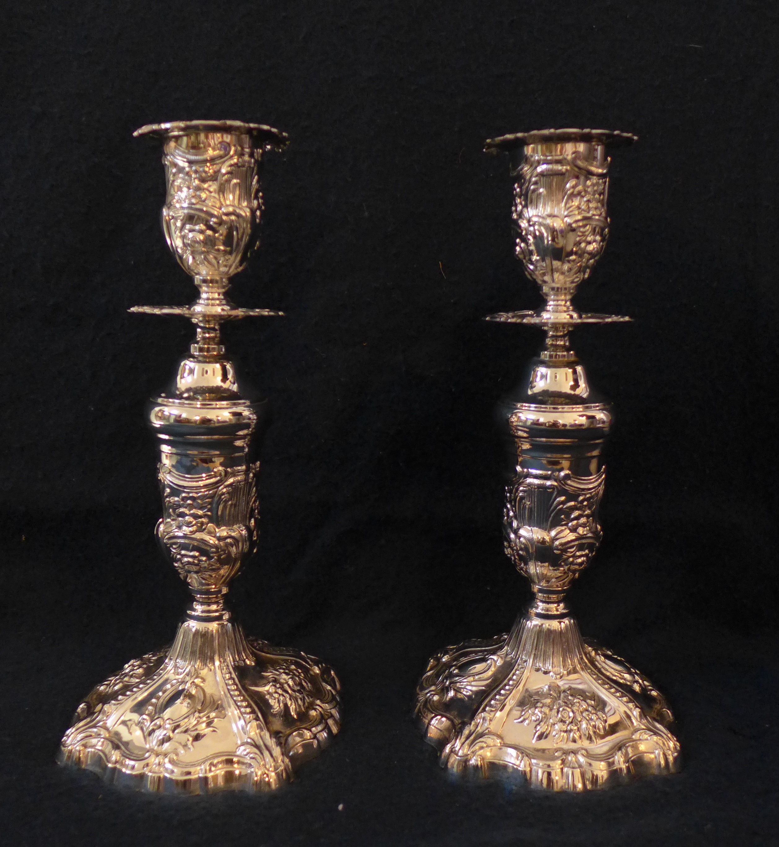 Juego de candelabros de moderna factura, pero no exentos de interés por su morfología y ornamentación, adoptando formas entre una suerte de neobarroco y estilo Imperio. Tienen base mixtilínea y moldurada, astil cilíndrico y soporte para la vela de forma semioval.