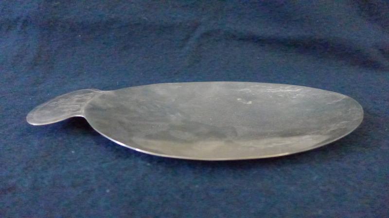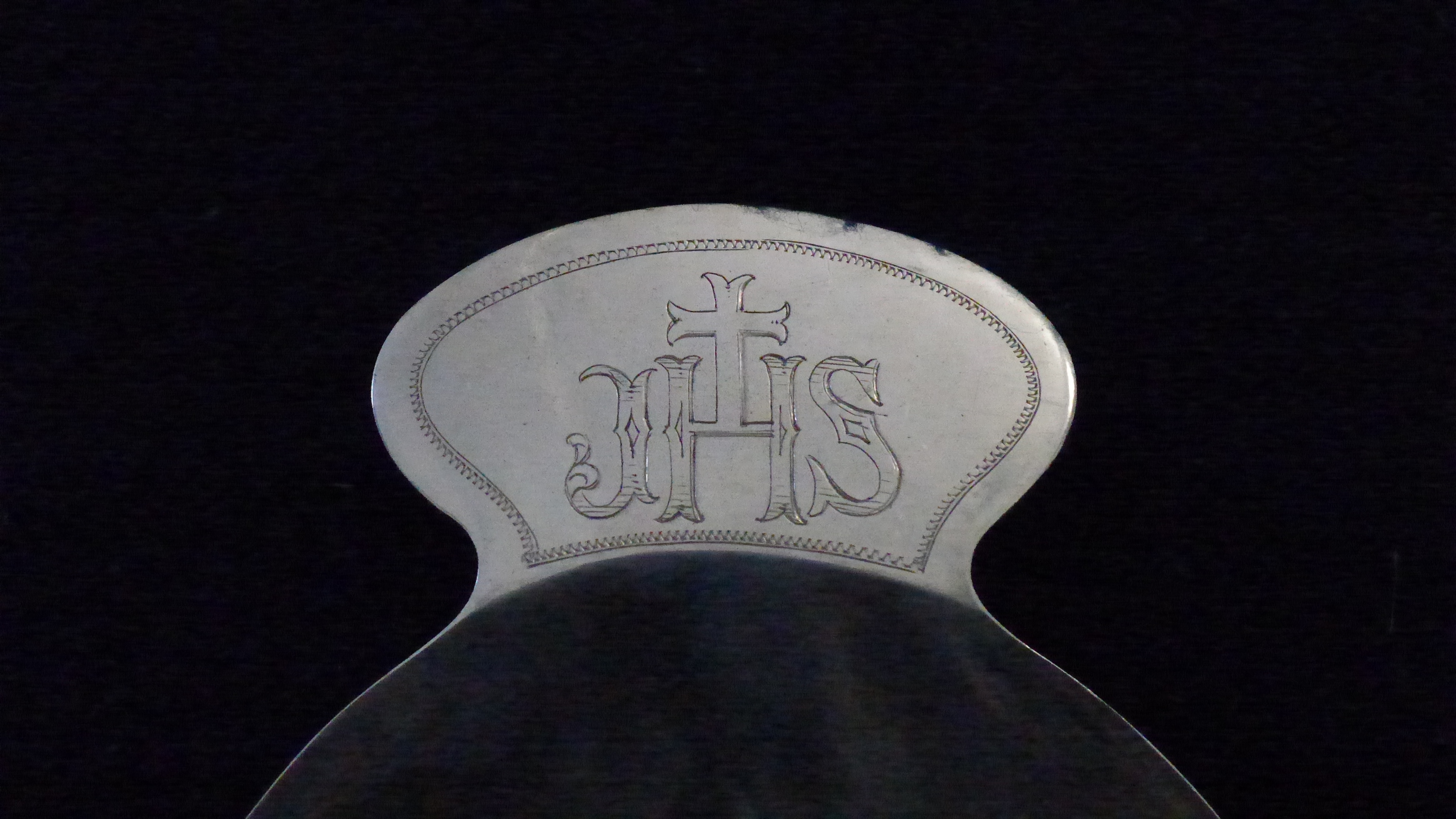 Salvilla o bandejita de plata utilizada durante la celebración de la Eucaristía. Presenta diseño sencillo, con un recipiente oval, ligeramente cóncavo y un asidero de forma similar aunque a menor tamaño y totalmente plano. En éste, y recercada por una cenefa troquelada reconocemos el emblema jesuítico por antonomasia (JHS), disponiendo una pequeña cruz sobre el vástago de la letra H. En el reverso de esta pieza encontramos sus contrastes.