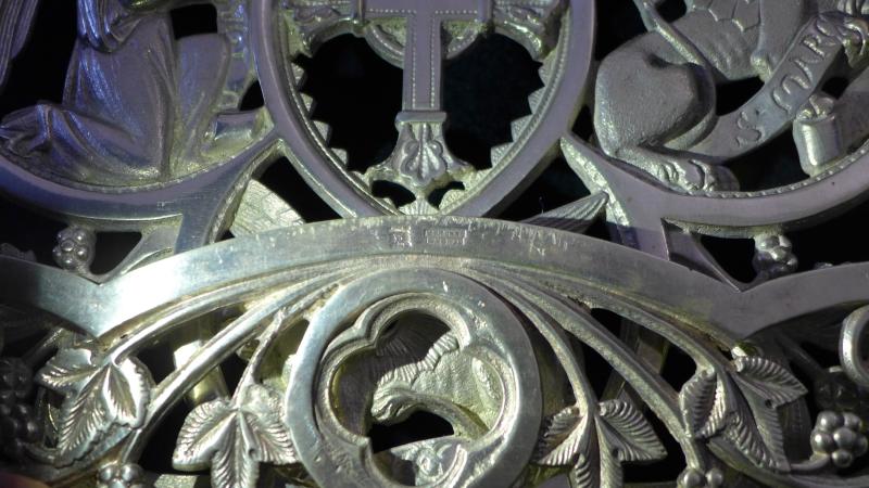 En uno de los motivos decorativos del frente se estamparon los punzones del taller Meneses: "M" (rodeada de resplandor) y "MENESES / MADRID"