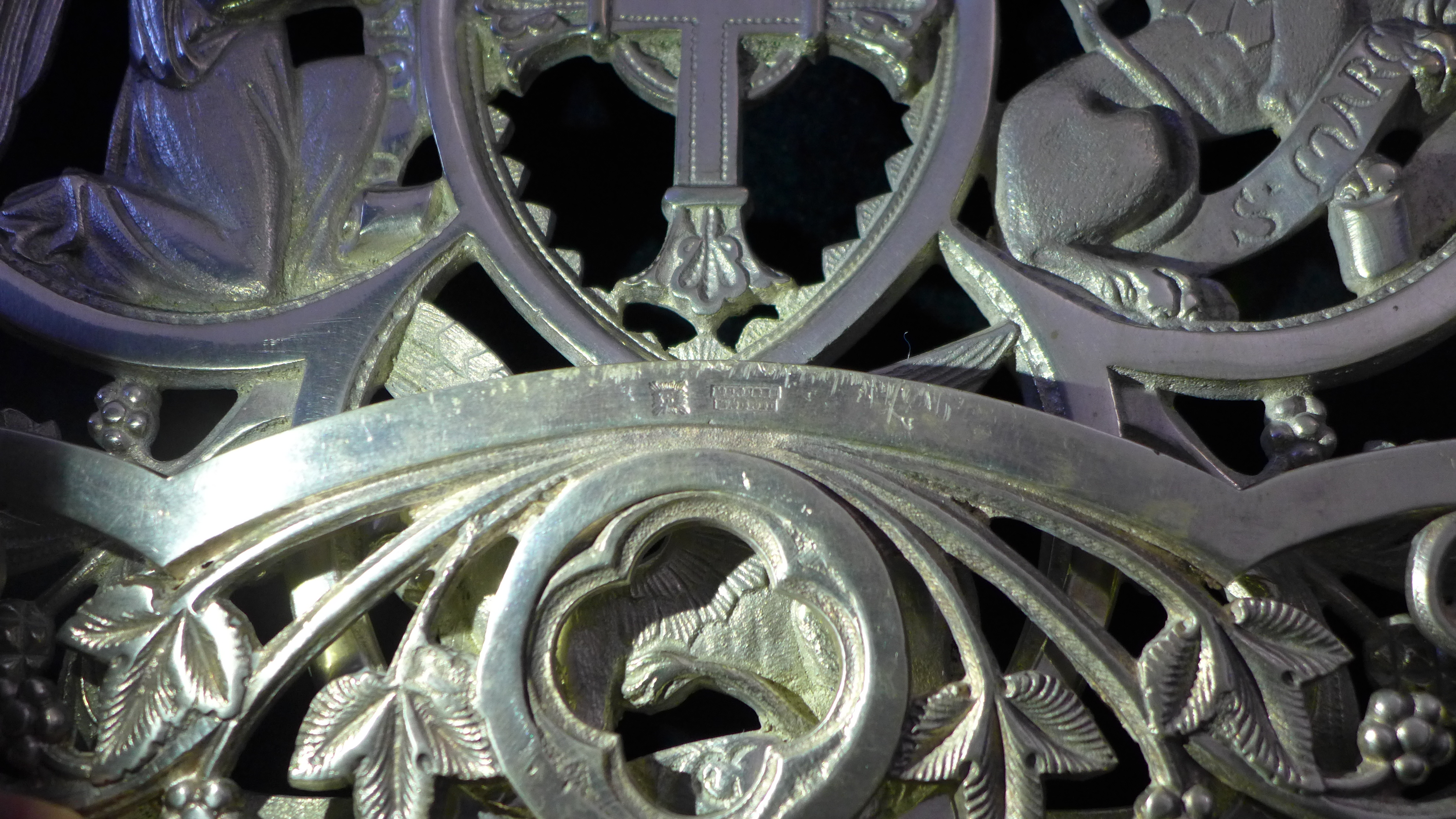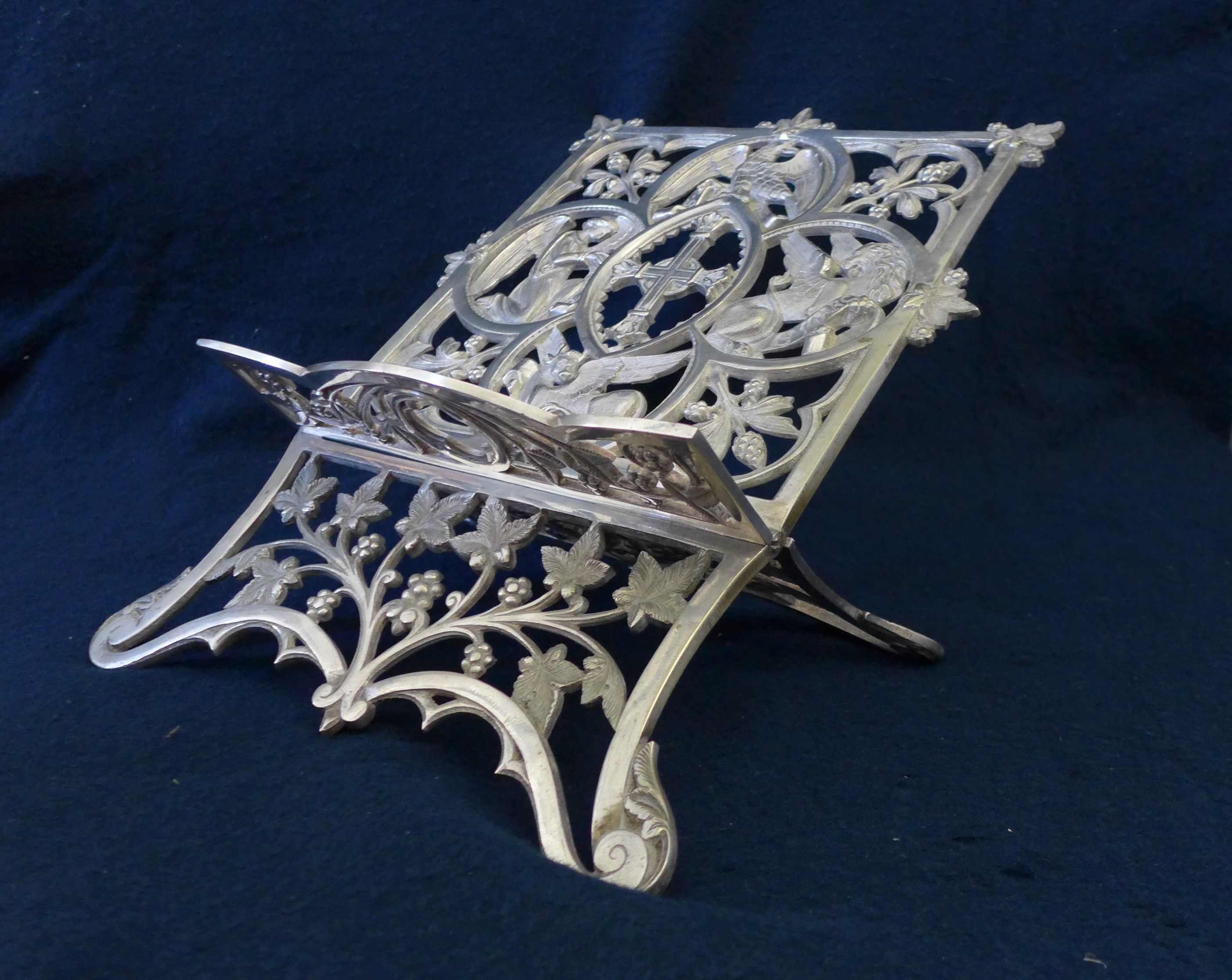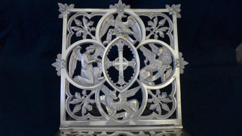 Atril neoclásico de metal plateado y factura industrial. Su estructura se pliega a la mitad por medio de un sistema de bisagras. Ambos cuerpos van calados y repletos de decoración figurada y vegetal. La zona más interesante es sobre la que descansan las cubiertas del libro recogiendo un diseño cuadrilobulado con un una cruz central y los símbolos del Tetramorfos. En esa misma zona, entre las hojas y frutos aparece estampado el cuño de los talleres Meneses.