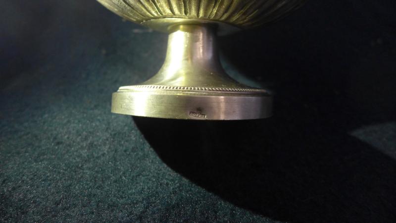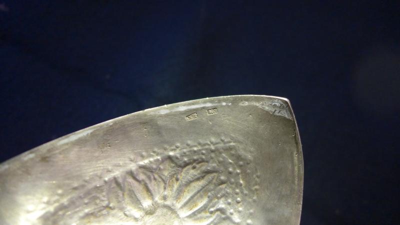 En el borde exterior del pie se estampó el punzón de su autor: "M/LOPEZ". En el interior de la proa figura las marcas de Madrid Villa y Corte, sobre el guarismo "2". En el mismo punto se realizó una burilada en zigzag.