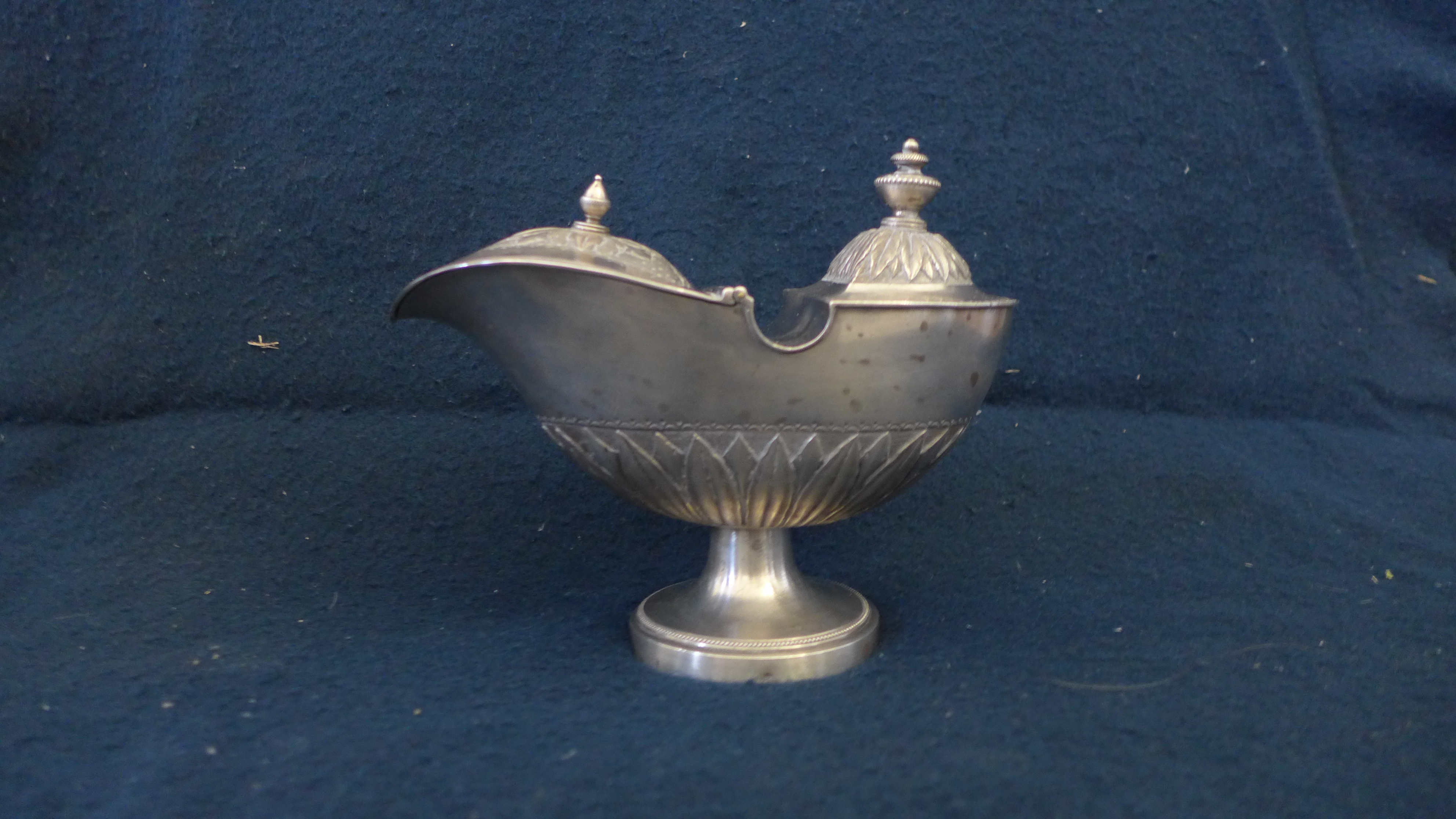Peana circular de remate troncocónico y nave ovalada, asimétrica y bastante profundidad. Proa y popa se separan por una ligera escotadura, mostrando la primera un remate en forma de pico. Sobre ambas partes se colocan sendas tapaderas abullonadas, aunque sólo la de la proa es abatible, pero las dos portan decoración hojas lanceoladas y un perillón fundido en su centro. Ese mismo tipo de exornos los encontramos también en la zona inferior de la nave, como si de una corola de hojas se tratase. Hace juego con el incensario que se cataloga a continuación.