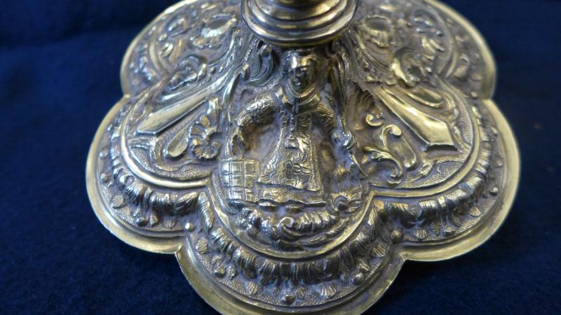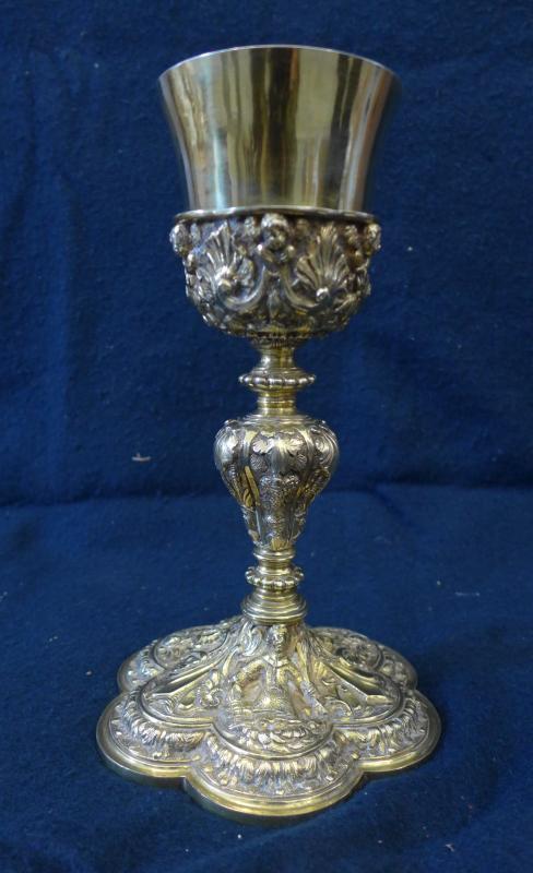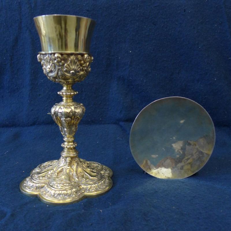 Cáliz de interesantísima factura, pero del que por ahora no podemos conocer su autoría dado lo frustro de su punzones. Se trata de una extraordinaria pieza rococó con profusión por las piezas fundidas, repujadas y cinceladas tanto en el pie como en la rosa. La base es lobulada, con abundantes exornos vegetales y algunos elementos figurados, como lo que parece ser una efigie de San Lorenzo (ataviado como diácono y con una parrilla en su mano derecha). El nudo es periforme y va cuajado de elementos simbólicos alusivos a la Eucaristía, pámpanos, hojas y racimos de uva, flanqueado arriba y abajo por sendas arandelas decoradas con contarios. La copa, acampanada, lleva la rosa labrada con cabezas de querubes, conchas y trapos, como es habitual en la época, pero con una volumetría considerable y con un trabajo cuidado y sugerente.