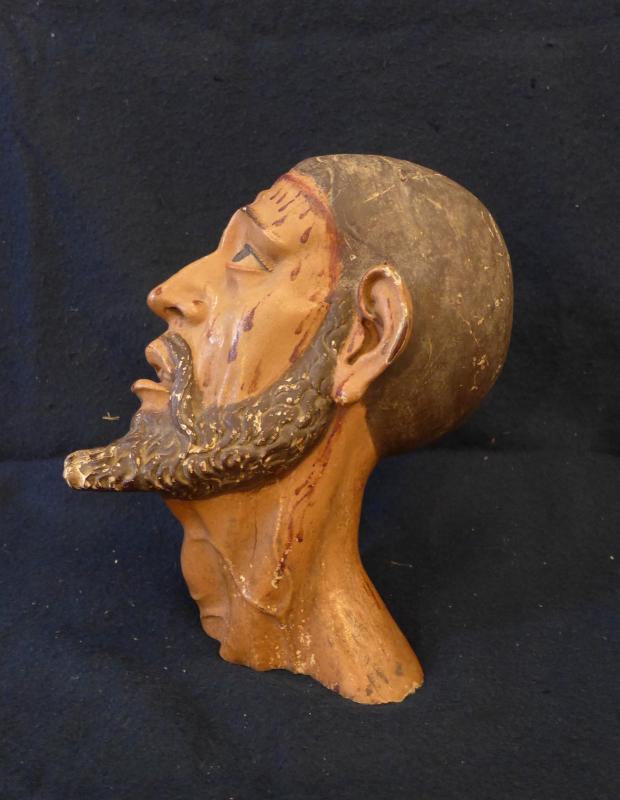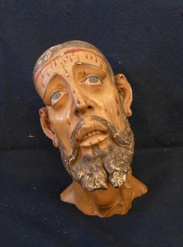Esta curiosa pieza viene a hablar de los gustos, de las modas y de las voluntades de quienes usan, valoran e históricamente tuvieron devoción hacia cualquier tipo de imagen. Como ocurriera en tiempos pasados, no hace tantos años que los cofrades de esta ermita encontraron poco atractiva y decorosa esta cabeza que pertenece al Nazareno que se conserva en el mismo templo, por lo que decidieron sustituirla por otra más acorde a los nuevos gustos. Con buen criterio esta se guardó, custodiándose en la sacristía. Es un rostro expresivo, dolorido, enjuto y de facciones muy marcados, su canon es alargado, con barba partida, ojos abiertos, cejas dispuestas en oblicuo y boca entreabierta que deja ver la dentadura superior. El busto llega hasta la parte baja del cuello, donde también se aprecia el trabajo cuidadoso de su autor, marcando venas y músculos.