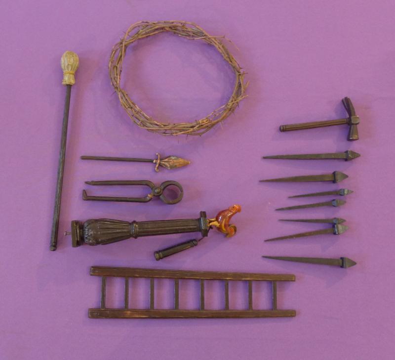 Como la anterior cartela, estos objetos forman parte de las celebraciones de la Pasión. Se trata de pequeños objetos de madera, de factura popular y relativamente moderna que se componen de: 7 clavos, un martillo, una tenaza, una lanza, una columna sobre la que se asientan el gallo y los azotes, una corona de espino natural, una caña con su hisopo y por último una pequeña escalera.