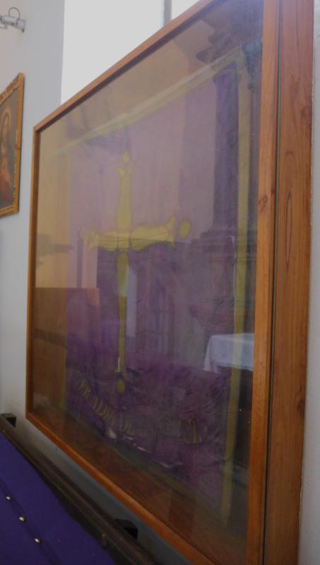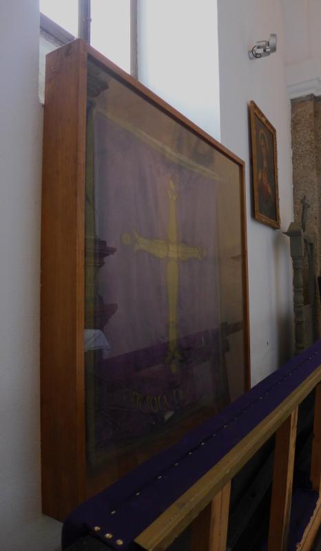 xxx Estandarte antiguo. Cruz ajarronada con remate bicaudado y bola terminal. Tafetán y galón dorado