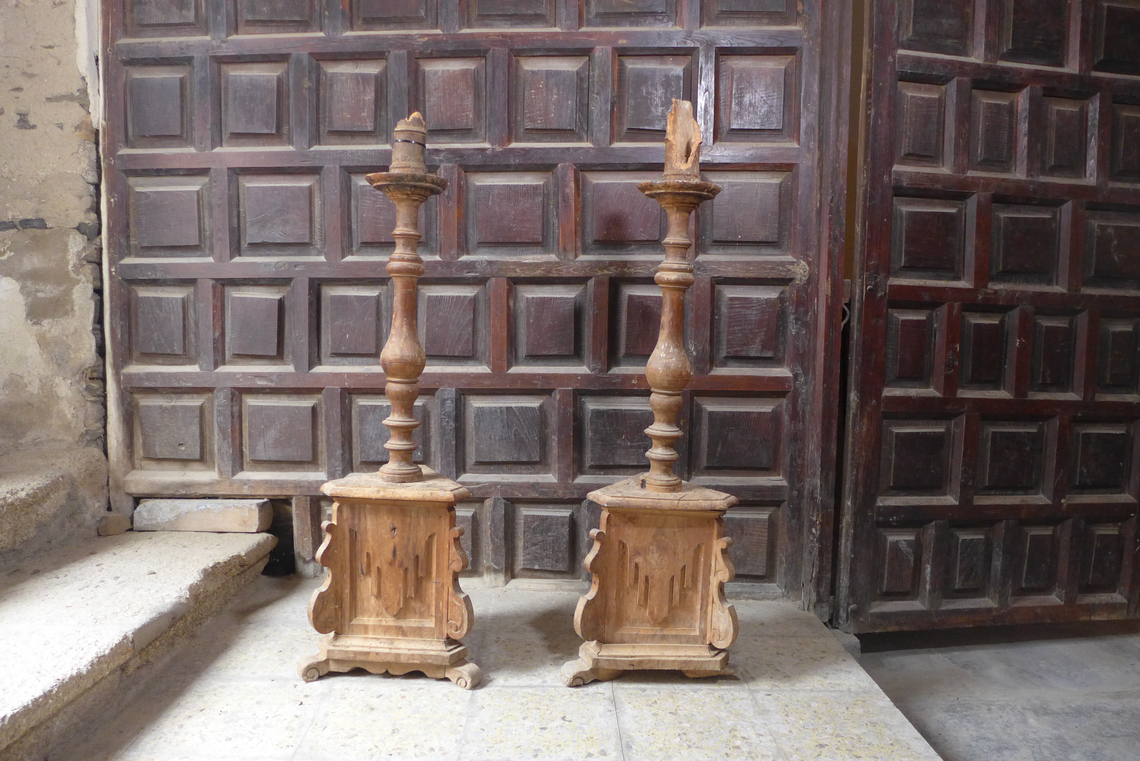 Hacheros de vástago torneado con molduras de distintos tamaños y pie triangular construido a partir de placas rectangulares con costillas en sus ángulos y aplacados mixtilíneos en sus frentes. Bajo el pie asoman tres patas a modo de piezas enrolladas. Carecen de policromía