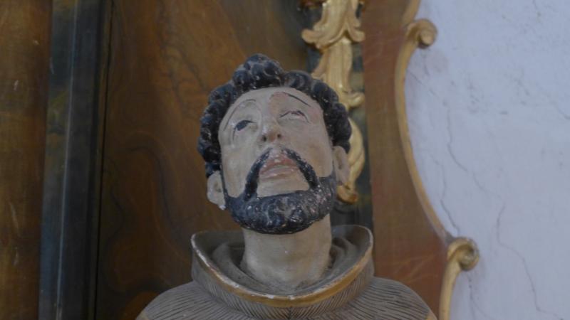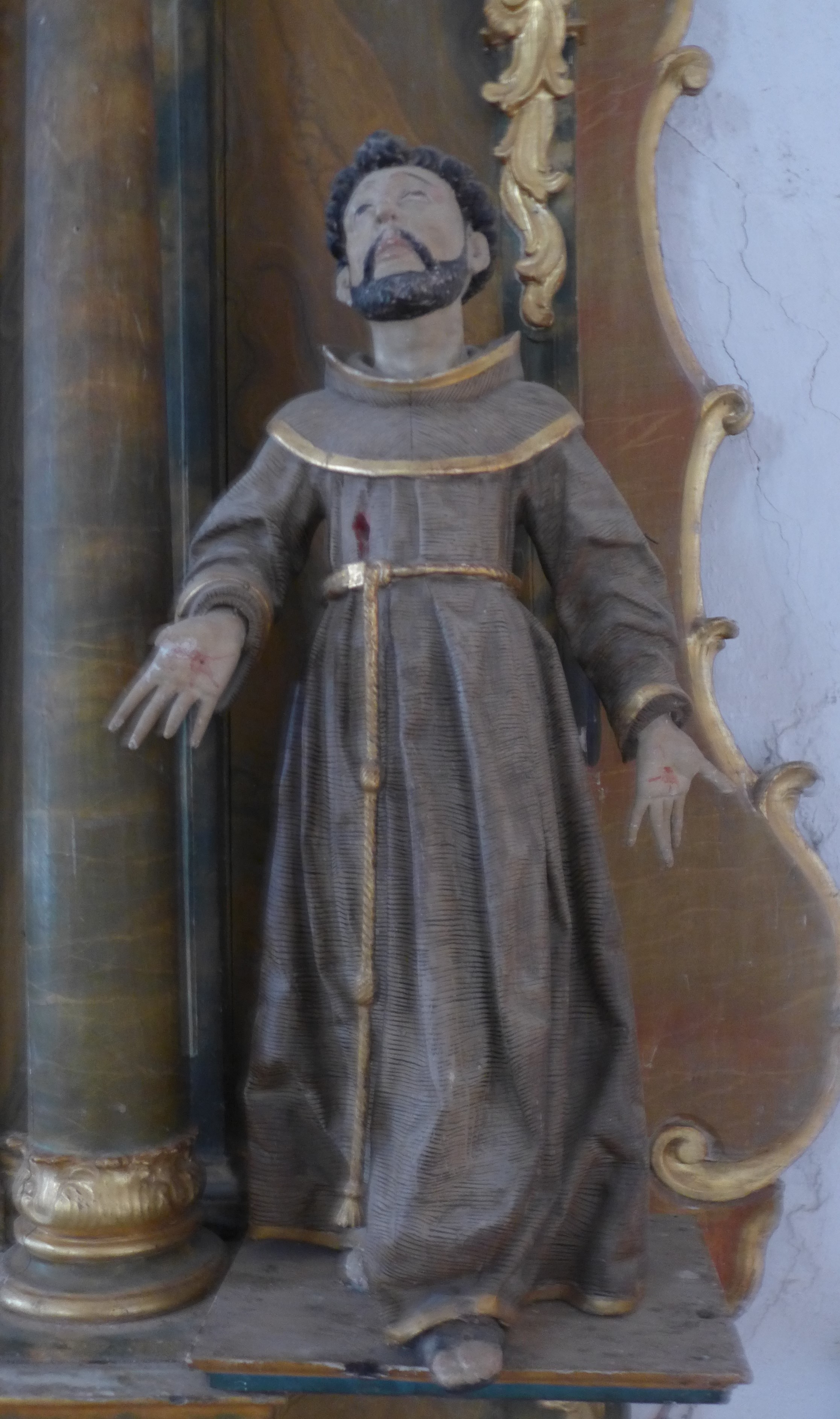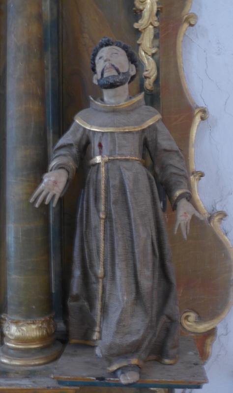 Uno de los santos franciscanos por antonomasia es el que se dispuso en el costado izquierda del retablo del Santo Cristo. Hace pareja, en realidad, con San Antonio, al que encontramos en lado contrario. Ambos se muestra en pie, al paso, lo que provoca que su hábito se mueva generando profundos claroscuros en sus pliegues. Su vestimenta va ceñida a la cintura pendiente por delante el correspondiente cordón. Muestra las palmas con los estigmas de la Pasión, igual que resulta visible en el pecho la mancha de sangre que mana del costado. Quizá lo menos logrado del conjunto sea la cabeza, de huera expresión y rasgos escasamente definidos. Luce barba, tonsura y dirige la mirada a las alturas.