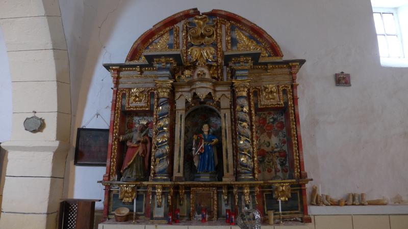 Retablo barroco de los que comúnmente la historiografía denomina genéricamente churrigueresco por la aparición en ellos de columnas salomónicas y una recargar ornamentación al modo que extendieron los hermanos Churriguera desde Salamanca. Sin embargo, por estas tierras bercianas abundaron también los maestros que hicieron este tipo de máquinas y entendieron bien los artificios de este estilo. En este caso se trata de una pequeña máquina organizada en un único cuerpo con su correspondiente banco y ático de limitada presencia, aunque imbuidos de ese espíritu decorativo tan característico a base de hojas carnosas y motivos fitomorfos dorados. Es el piso principal donde se concentra la iconografía y la decoración, con tres calles separadas por las ya referidas columnas. Las calles laterales tienen encasamientos rectangulares, aunque con unas orejetas superiores que desbordan la línea de la caja, ambas perimetradas por cenefas de hojitas. La calle central se cerraría en arco de medio punto de similar tamaño, pero en el siglo XIX se ocultó mediante un arquete neoclásico añadido con guardamalletas y forma de baldaquino. Su policromía a base de jaspeados, dorados y motivos florales resulta muy llamativa.