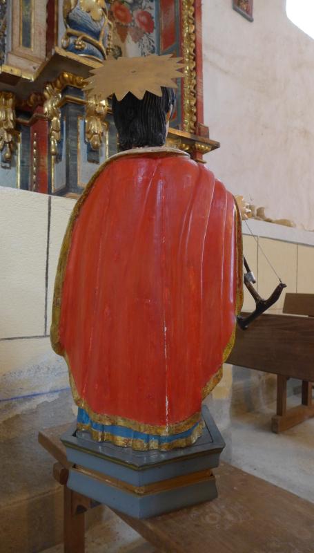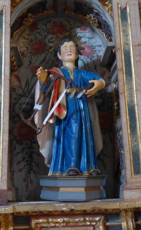 Imagen de bulto redondo de factura bastante popular representando a San Tirso. Viste túnica larga hasta los pies de color azulado ceñida a la cintura y un manto blanco y rojo que cuelga dese su hombre derecho. Sus brazos van elevados, de modo que con la mano izquierda sujeta un libro y en la derecha porta un sierra, instrumento de su martirio. Su rostro juvenil e imberbe va rodeado de una larga melena que le cae hasta los hombros. Bajo la túnica asoman las puntas de su calzado.