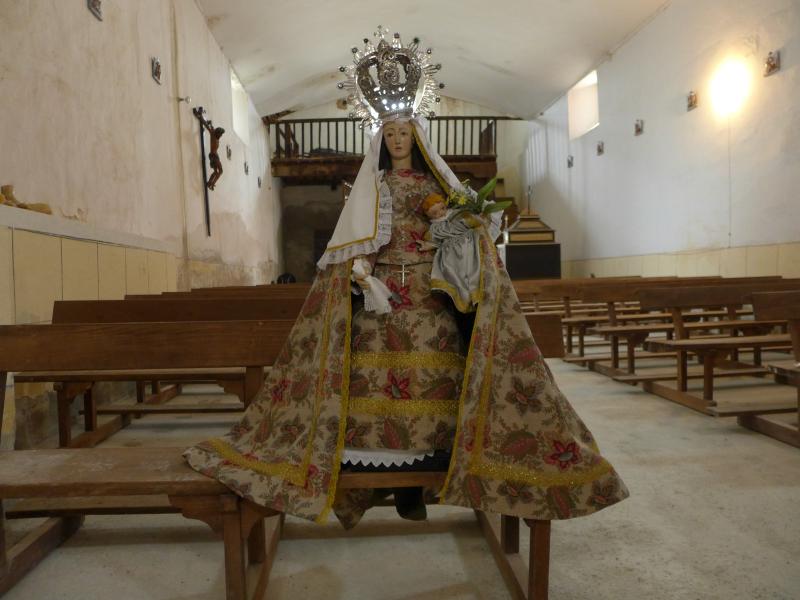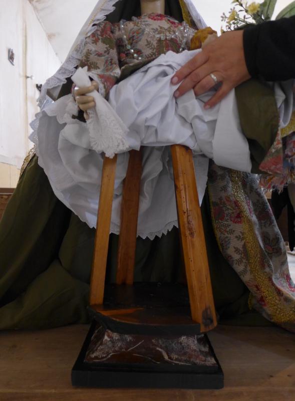 Imagen vestidera (de bastidor) de factura popular, a la que únicamente se tallaron manos y cabeza, Su mirada ensimismada denota las limitaciones del artista.