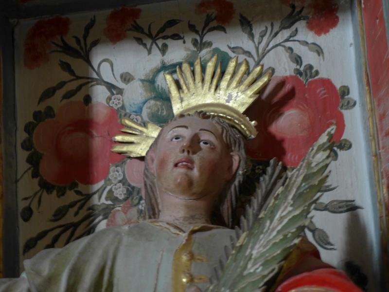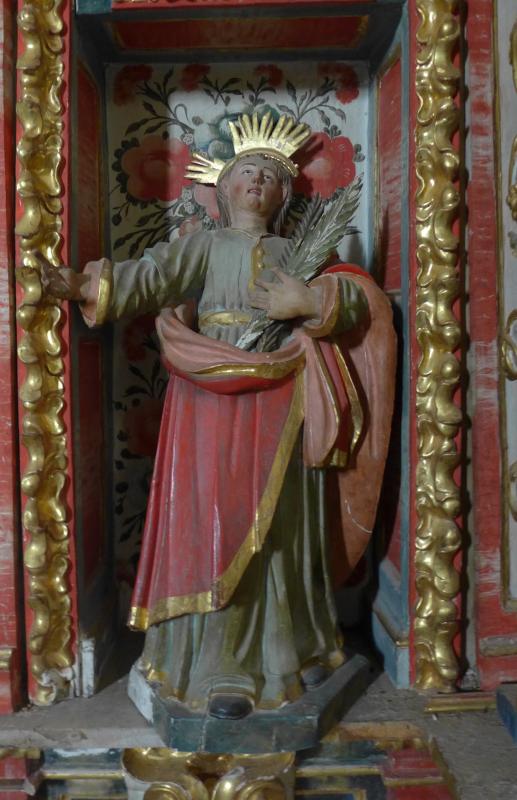 Esta imagen hace pareja con la del patrón San Tirso, pero a diferencia de aquella mantiene su policromía original. Viste túnica verde ceñida a la cintura y manto rojo con orillo dorado que se enrolla alrededor de su cuerpo y de su antebrazo izquierdo. Alza la cabeza mirando al cielo, como en éxtasis. Su rostro resulta inexpresivo y de facciones escasamente definidas. Luce melena larga que cae por detrás de los hombros y ojos de vidrio. Con su mano izquierda lleva la palma del martirio y la derecha va vacía, pero estirada, en la que quizá llevaba algún otro atributo iconográfico hoy perdido.