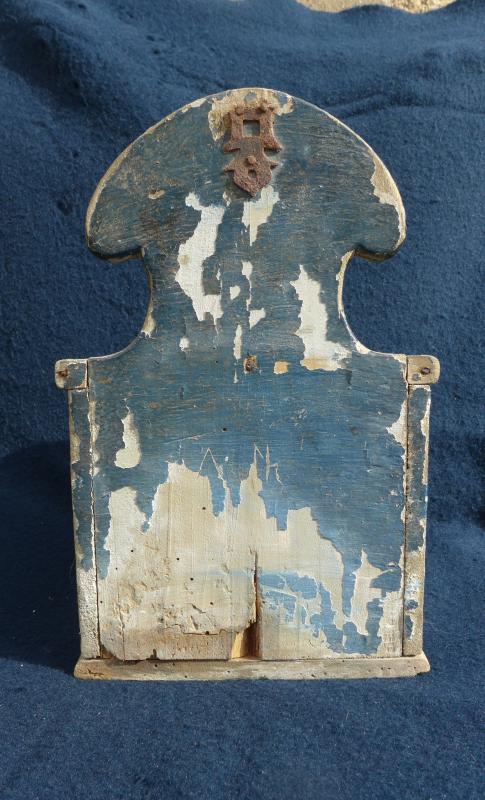 Caja cuadrangular con tapa abatible y respaldo lobulado en su parte trasera. Carece de asa en su parte anterior, pero muestra una pieza de metal que quizá sirvió para colgarse en la pared del templo. Muestra policromía azulada y blanca con diseños geométricos en sus costados. En el respaldo lleva inscripción sobre su pertenencia y función.