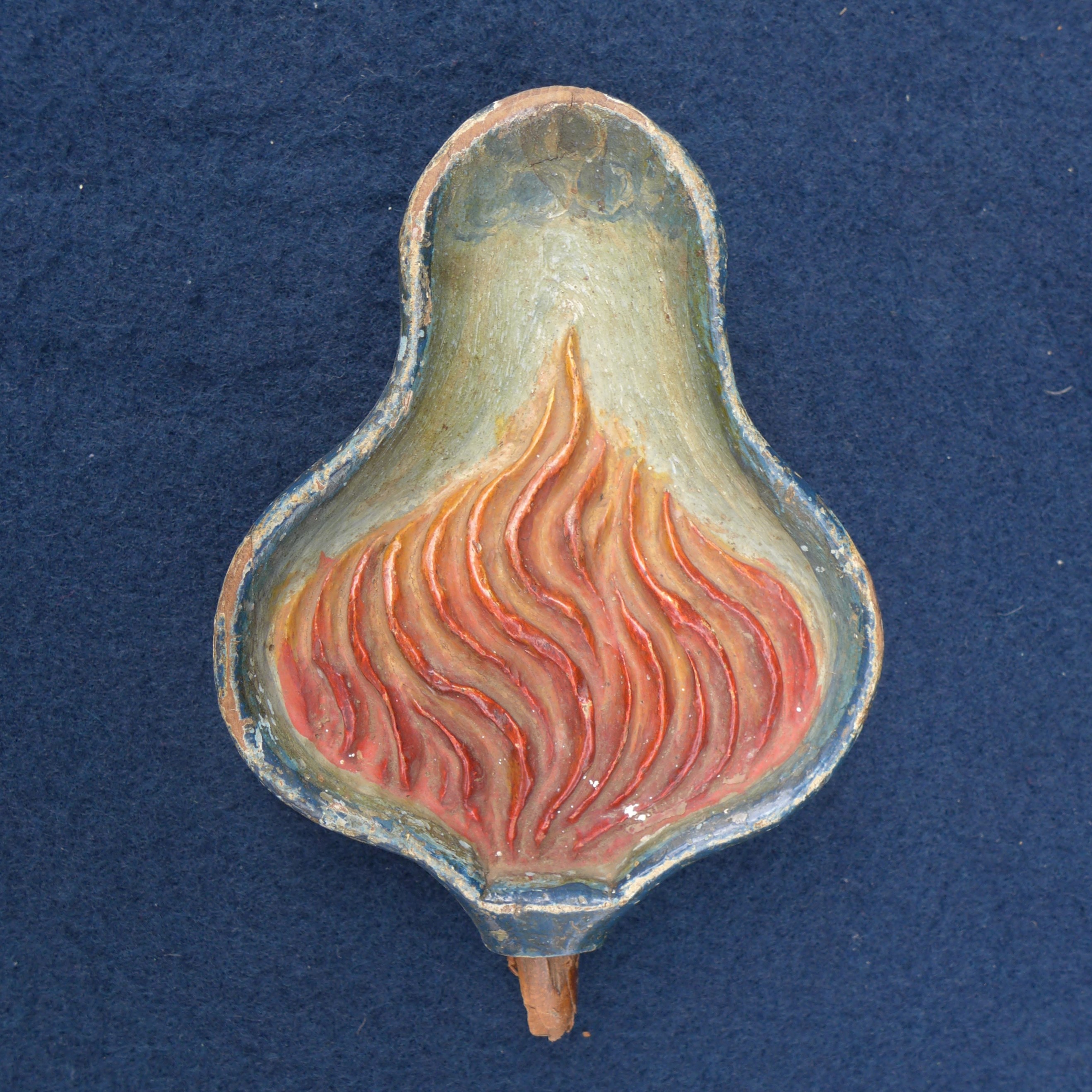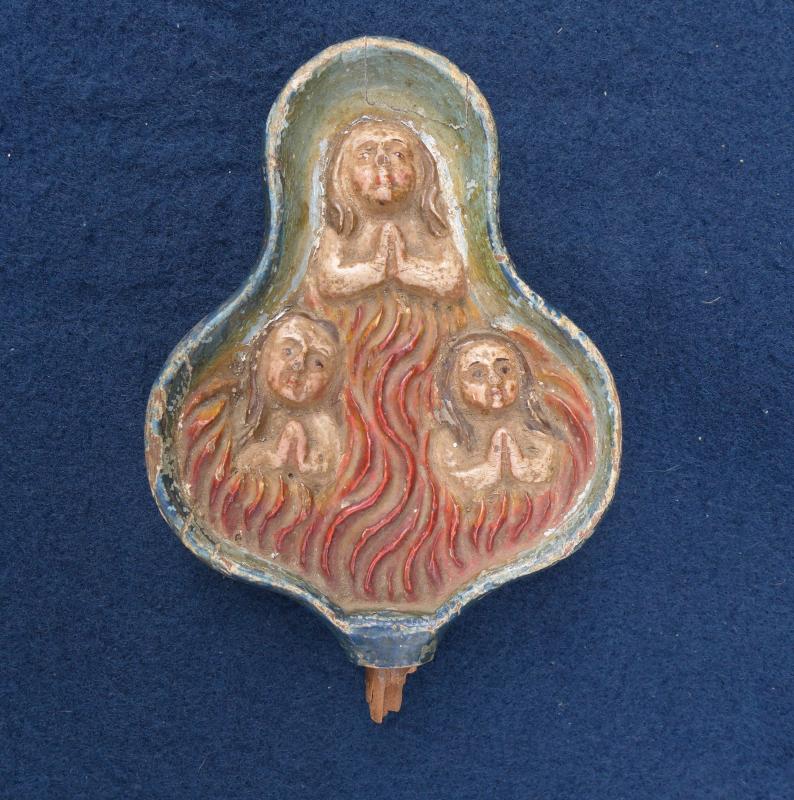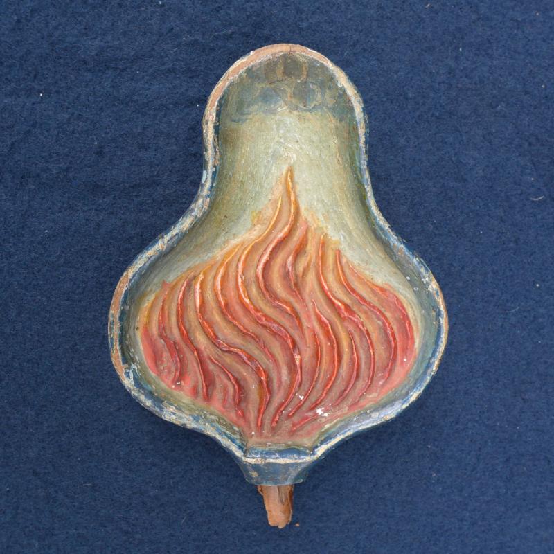 Esta interesante pieza no es sino el remate o insigna de una vara de la Cofradía de las Ánimas de Lombillo. Son varios los objetos que conserva al ermita pertenecientes a dicha hermandad, lo que da cumplida cuenta de la importancia que adquirió a lo largo de su historia. La insignia tiene forma trilobulada y es de pequeño tamaño, mostrando en su parte inferior un fragmento del vástago donde iría ensamblada la vara para poder portarla. En su anverso, rehundido, se tallaron tres figuras de ánimas rodeadas por llamas, por lo que únicamente vemos sus bustos, con las manos unidas en oración y larga cabellera. En el reverso, igualmente rehundido, tan sólo se aprecian unas llameantes lenguas de fuego, talladas y policromadas. El contorno y borde tiene una irisada policromía azul verdosa.