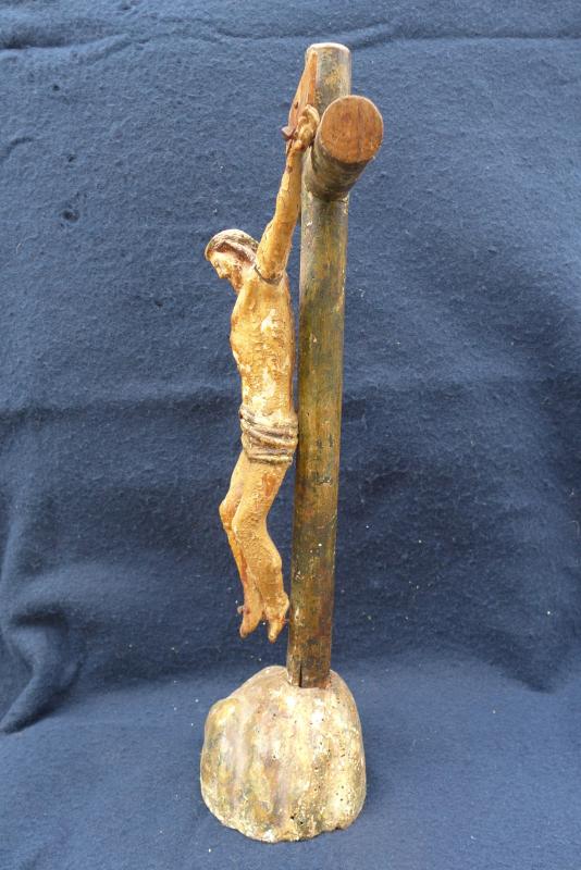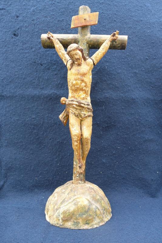 Pequeña cruz sobre peana hemisférica (remedando el Gólgota), que habitualmente se solía colocar sobre mesa de altar presidiendo los actos litúrgicos. La cruz es de travesaños cilíndrico con titulus en la parte superior. El Cristo, muy maltrecho, muestra problemas estructurales en la unión de brazos y torso, y a pesar de las pérdidas de policromía resulta visible un estudio anatómico bastante sumario. Porta escueto paño de pureza de pliegues paralelos, anudado en la cadera derecha. Su cabeza cae hacia la derecha disponiendo las guedejas de su melena sobre el hombro. Muestra corona de talla.