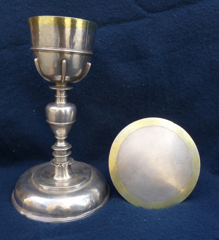 En uso se encuentra aún hoy este juego de cáliz y patena. El cáliz acomoda su base aun diseño tradicional de tres alturas siendo la central la más destacada y de perfil abocelado. Mucho más interesante resulta el astil, que encadena arriba y abajo una serie de carretes y cuellos de distinta forma y desarrollo, además de alguna arandela separadora, disponiendo en su centro un nudo semioval partido en dos por una moldura lisa. La copa, de perfil bastante recto, lleva listel decorativo hacia la mitad de la misma y una corola de gallones redondeados en su rosa. La patena es circular y dorada, sin ninguna particularidad reseñable.