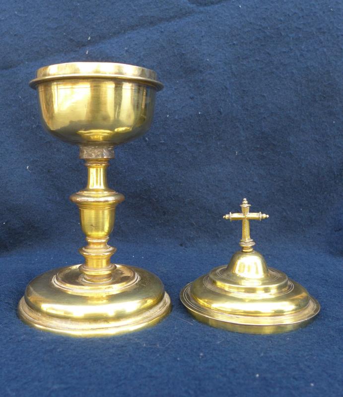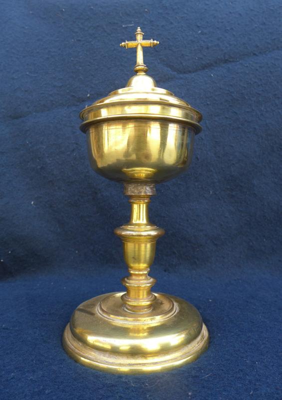 Copón de pie abullonado de tres alturas, las dos exteriores de perfil recto, la central convexa. En el centro se ajusta el astil, de nudo ajarronado, gollete de tipo carrete y cuello troncocónico para dotarle de cierta esbeltes. La copa tiene perfil cilíndrico, roto únicamente por la pestaña que aflora en su parte superior y que sirve para encajar la tapadera. Esta última se asemeja a la propia basa del copón, pero con un remate cupulado en que encaja una pequeña cruz latina de travesaños diédricos y remates esféricos. Llama la atención la mezcla de materiales utilizada, lo que quizá explique también la soldadura a la altura de la copa, única parte de plata pues el resto es de bronce.