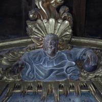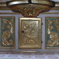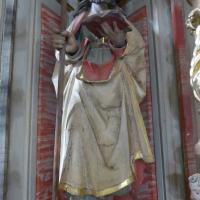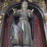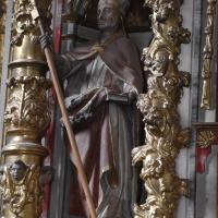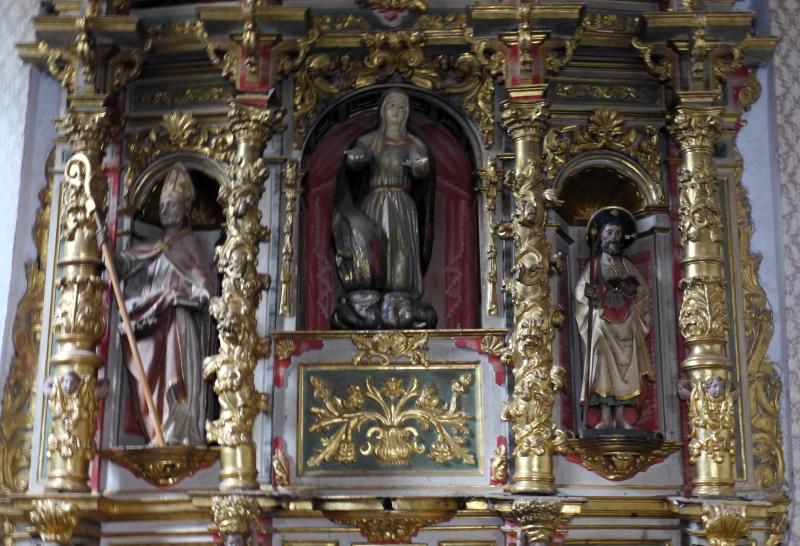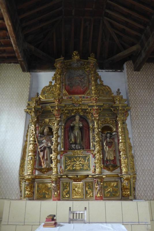 Recuerda la tipología de este retablo, tanto en sus formas como en sus soportes a uno de los laterales (sin policromadas) de la iglesia de San Martín de Salas de los Barrios. En él se integraron, además, imágenes de distintas épocas, quizá procedentes de retablos ya desaparecidos o incluso de otros edificios (hospitales, por ejemplo). El basamento va jalonado por ménsulones y niños atlantes, mientras que el cuerpo principal se divide entre calles mediante finas columnas salomóncias y soportes abalaustrados. El ático, de cierto desarrollo, muestra en su centro un relieve octogonal de las Benditas Ánimas y dos aletones en los laterales. Tres son las imágenes de bulto que llenan las hornacinas en arco de medio punto que completan en cuerpo central. Respecto a la decoración secundaria abundan los motivos fitomorfos, todos dorados, que se mezclan con una superficie de colores lisos próxima a los gustos del siglo XIX a base de marmoleados y jaspeados.