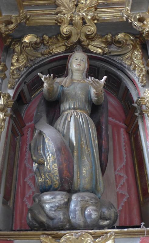Si nos atenemos a la descripción qu de la misma hace Voces Jolías, esta imagen sería una Virgen de la Encarnación (titular de la ermita), cuya extraña pose sería la recibir el Espíritu Santo, de hinojos y con las manos extendidas. En efecto, se arrodilla sobre una especie de nubes, arremolinándose su manto a ambos lados del cuerpo. Flaquea el maestro en el tratamiento de los plegados, siendo los de la túnica paralelos y anodinos. El rostro, redondeado y de facciones regordetas, resulta también bastante inexpresivo, ciñéndose por una toca blanca que cae por delante y por detrás de los hombros. Su policromía, a base de motivos vegetales y rocallas, comulga perfectamente con la cronología de la talla, por lo que serán coetáneas.