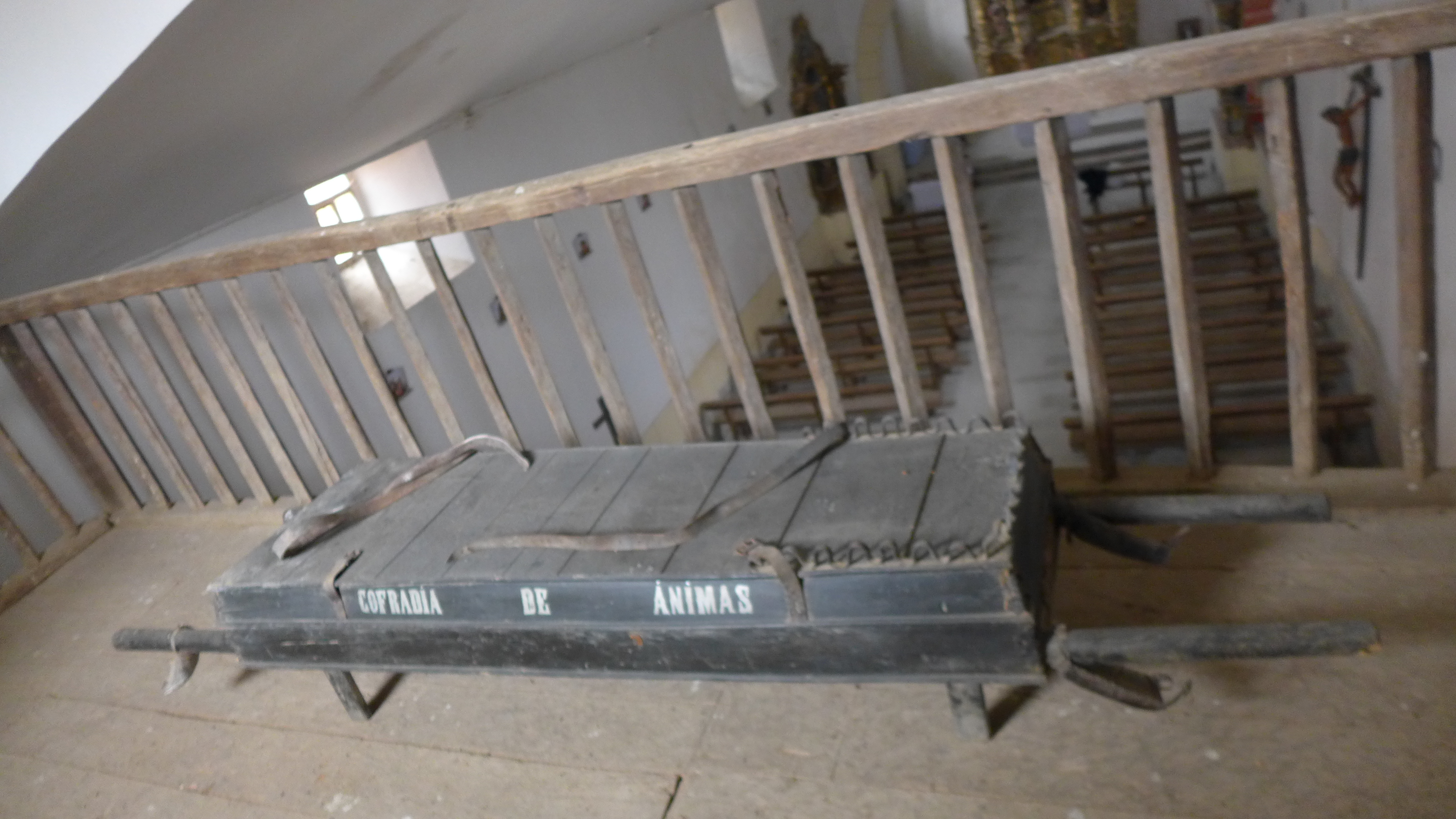 Estas parihuelas de madera pertenecieron a la cofradía de las Ánimas de Lombillo. Son un artilugio sencillo, compuesto de una cama rectangular con travesaños y tablas perpendiculares, cuatro varales y otras tantas patas para apoyarla en el suelo. Se mantienen aún los correajes originales de cuero, o una cenefa ondulante de hierro en la parte superior, donde se dispondría el difunto. Es un elemento puramente funcional por lo que llama la atención el detalle labrado de su frente, una especie de guirnalda con motivos textiles y vegetales. En su contorno se recoge una inscripción con letras de molde blancas sobre el fondo negro del mueble.