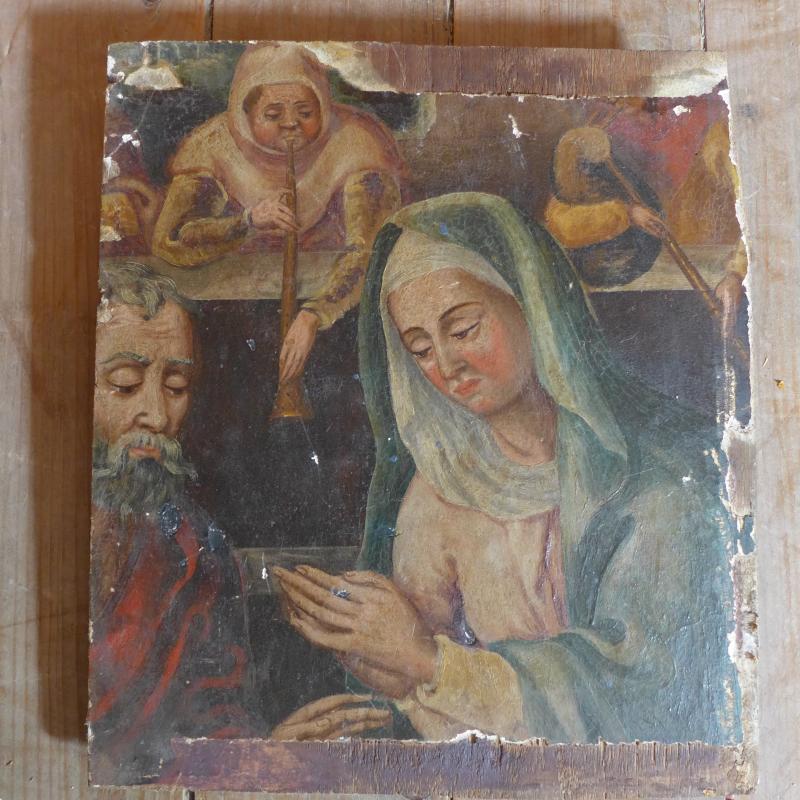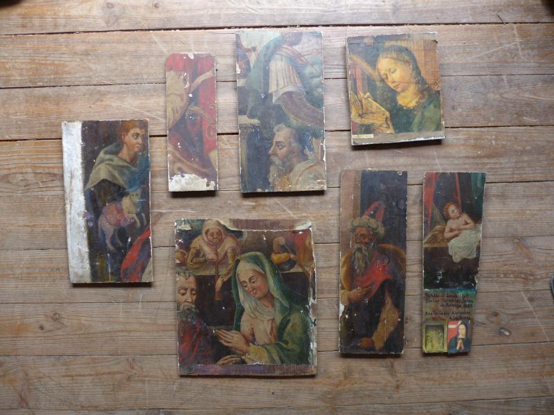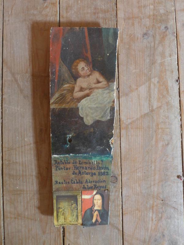 Según Voces Jolías estos seis fragmentos pertenecerían al banco del antiguo retablo mayor de Lombillo, encargado al pintor astorgano Hernando Pavón en 1586. Estas junto al resto del retablo se deshecharon a la hora de hacer la nueva máquina ya en época barroca. Según él mismo explica, algunos retazos fueron empleados para hacer un confesionario, colocando las pinturas hacia el interior del mismo. De allí las rescataría don Augusto Quintana cuando era párroco del lugar. Aparentemente pertenecen a dos tableros distintos, uno que trataría la Natividad y otro la Epifanía