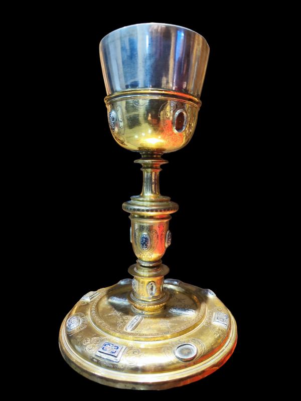 Cáliz de bronce dorado a fuego con la copa de plata. Manierista inspirado en los modelos madrileños de la platería madrileña del siglo XVII.